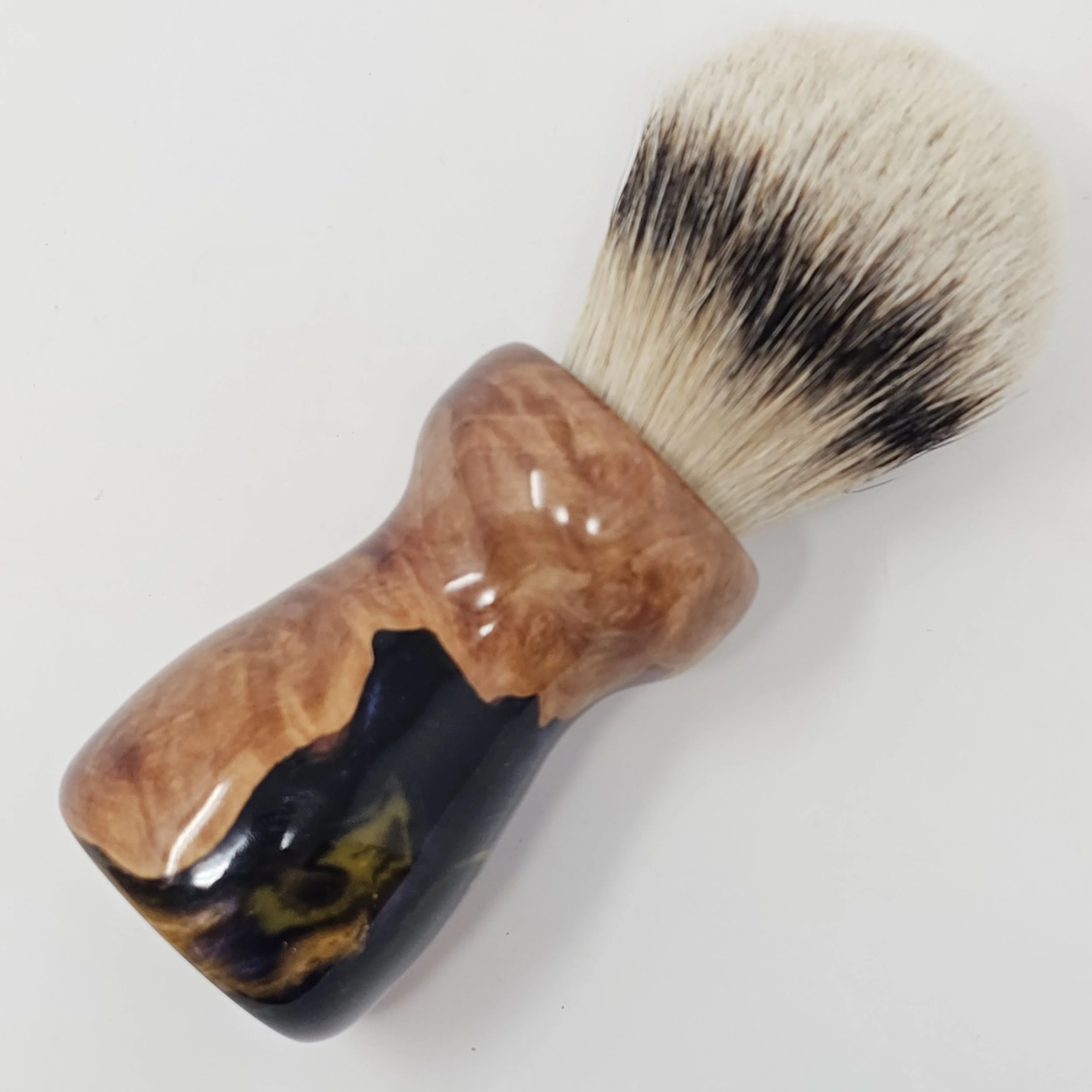 Conjure a richer, smoother shaving ritual with Witch's Brew, a handcrafted 26mm shaving brush handle turned from Australian Red Mallee Burl and a multi-colored swirled resin that looks as if it was stirred by a spell. This one of a kind brush is uniquely patterned—deep earth tones from the burl blend with vibrant, swirling resin hues to create a handle that feels both mystical and luxurious in the hand.