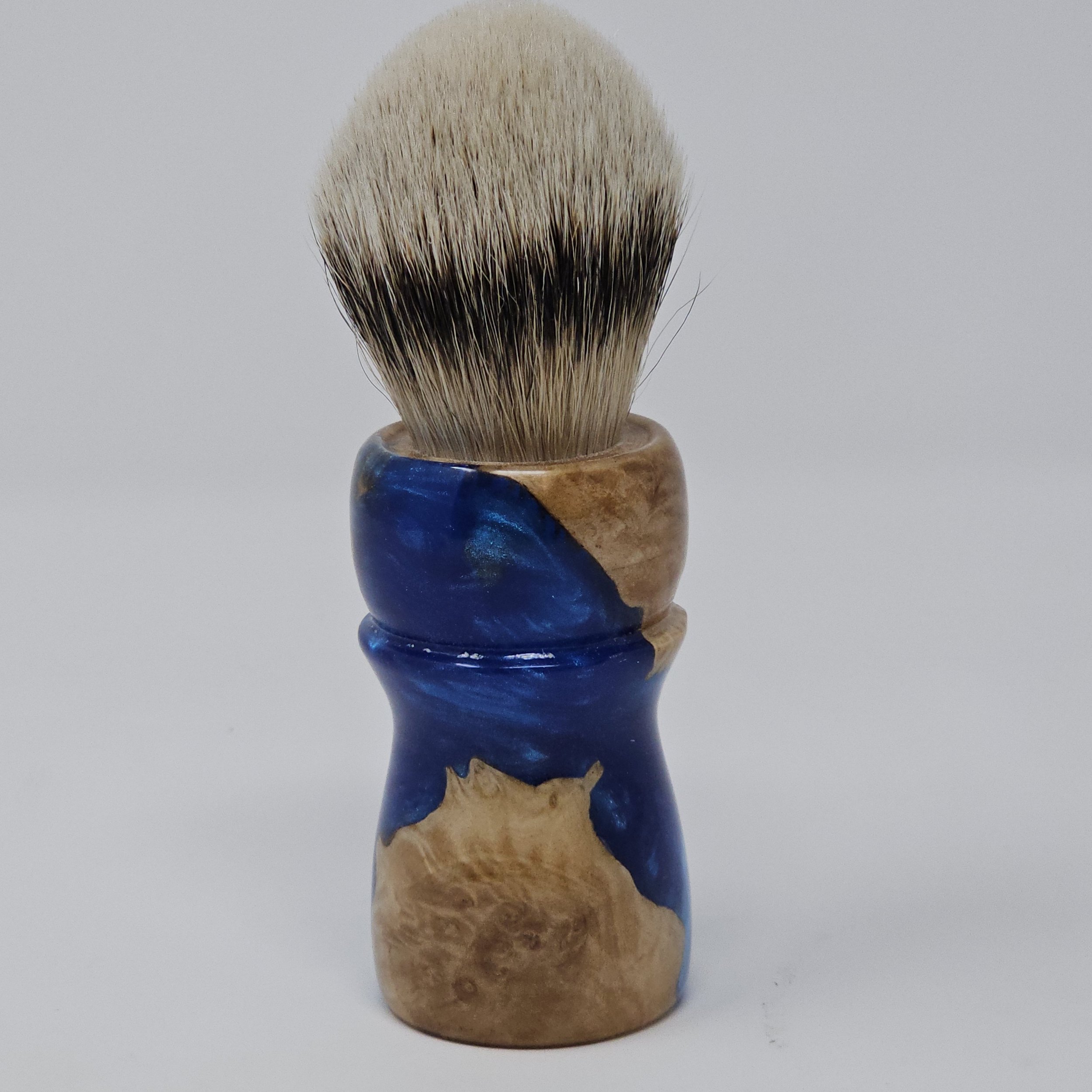 This 26mm shaving brush showcases the natural beauty of Australian Red Mallee Burl wood paired with flowing blue swirled resin, creating a handle that evokes motion, depth, and contrast. The warm, richly figured burl is complemented by vibrant blue resin patterns.
