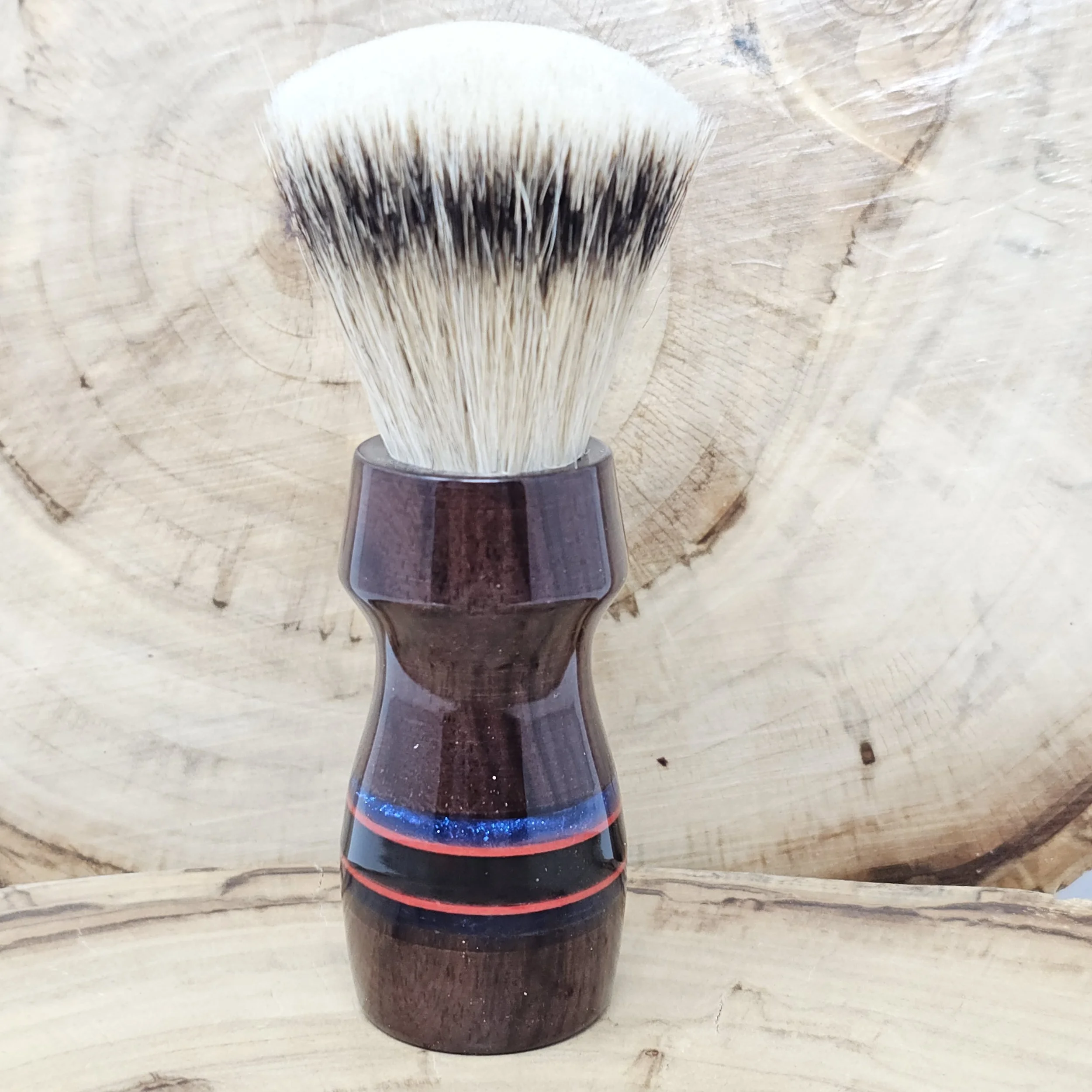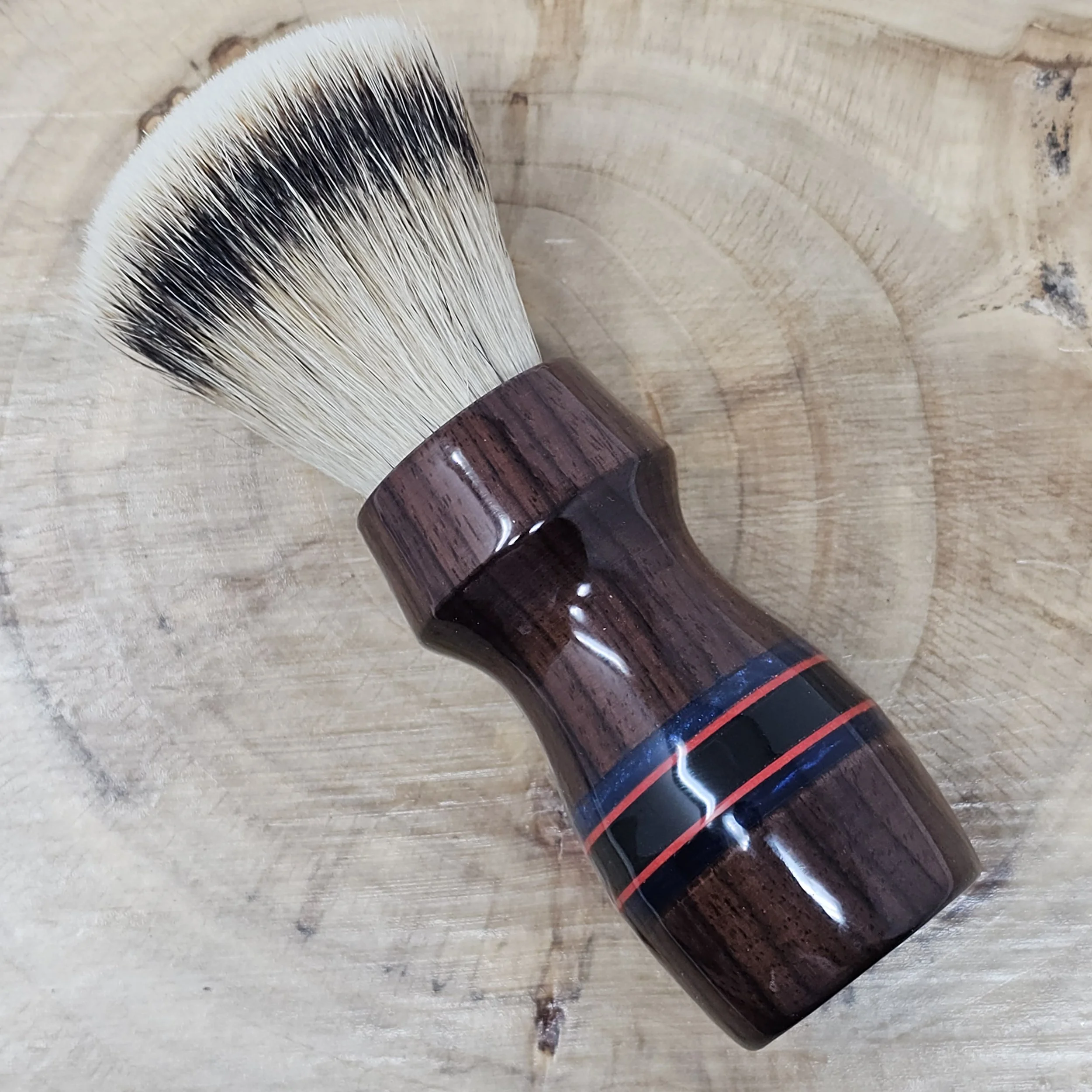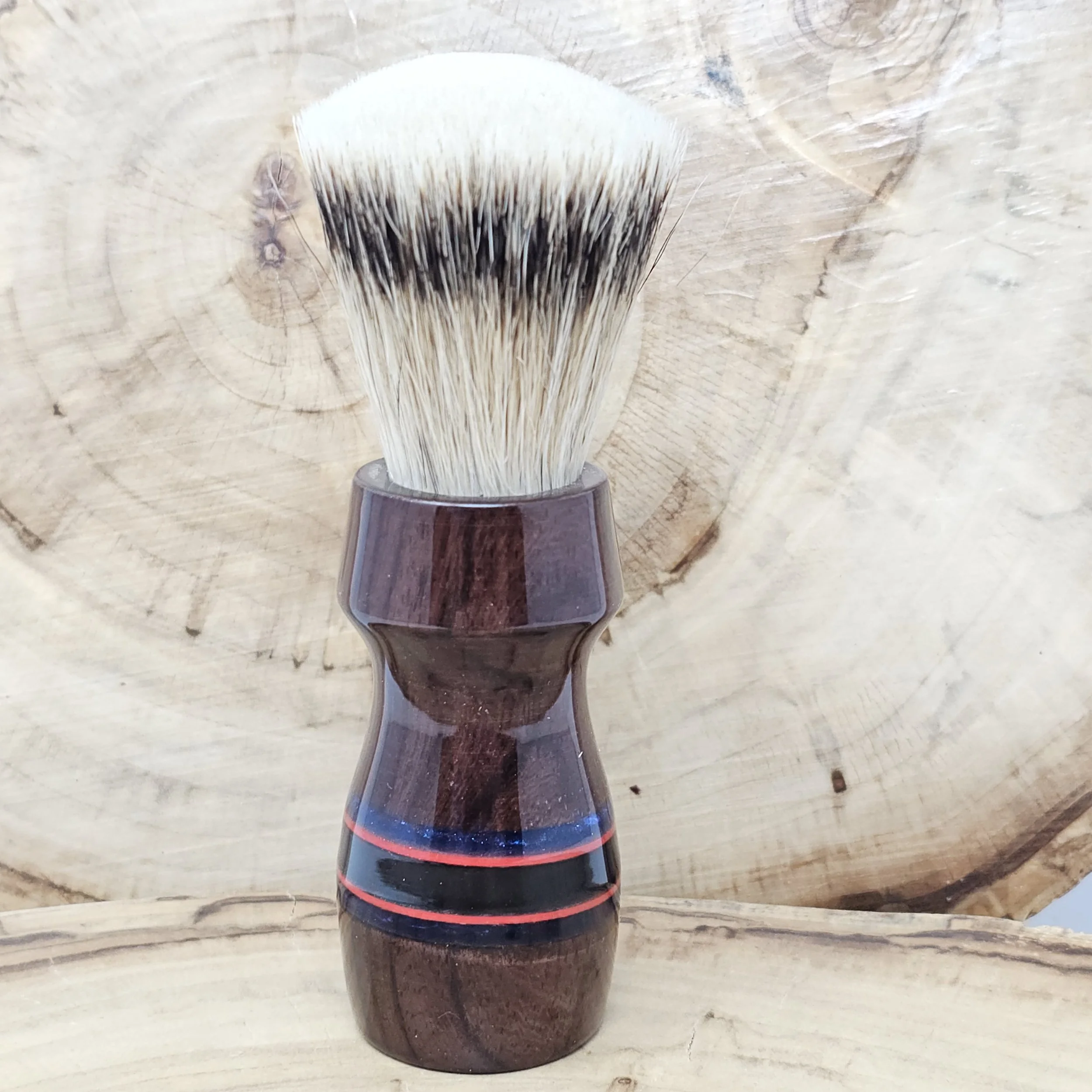 The Rosewood Renegade is a bold fusion of classic craftsmanship and striking modern detail. Handcrafted from rich Rosewood, this 26mm shaving brush showcases the wood’s deep, warm tones and natural grain patterns. Black, red, and blue striped inlays cut through the handle like racing lines, creating a dynamic contrast that makes this piece stand out on any shave den shelf.