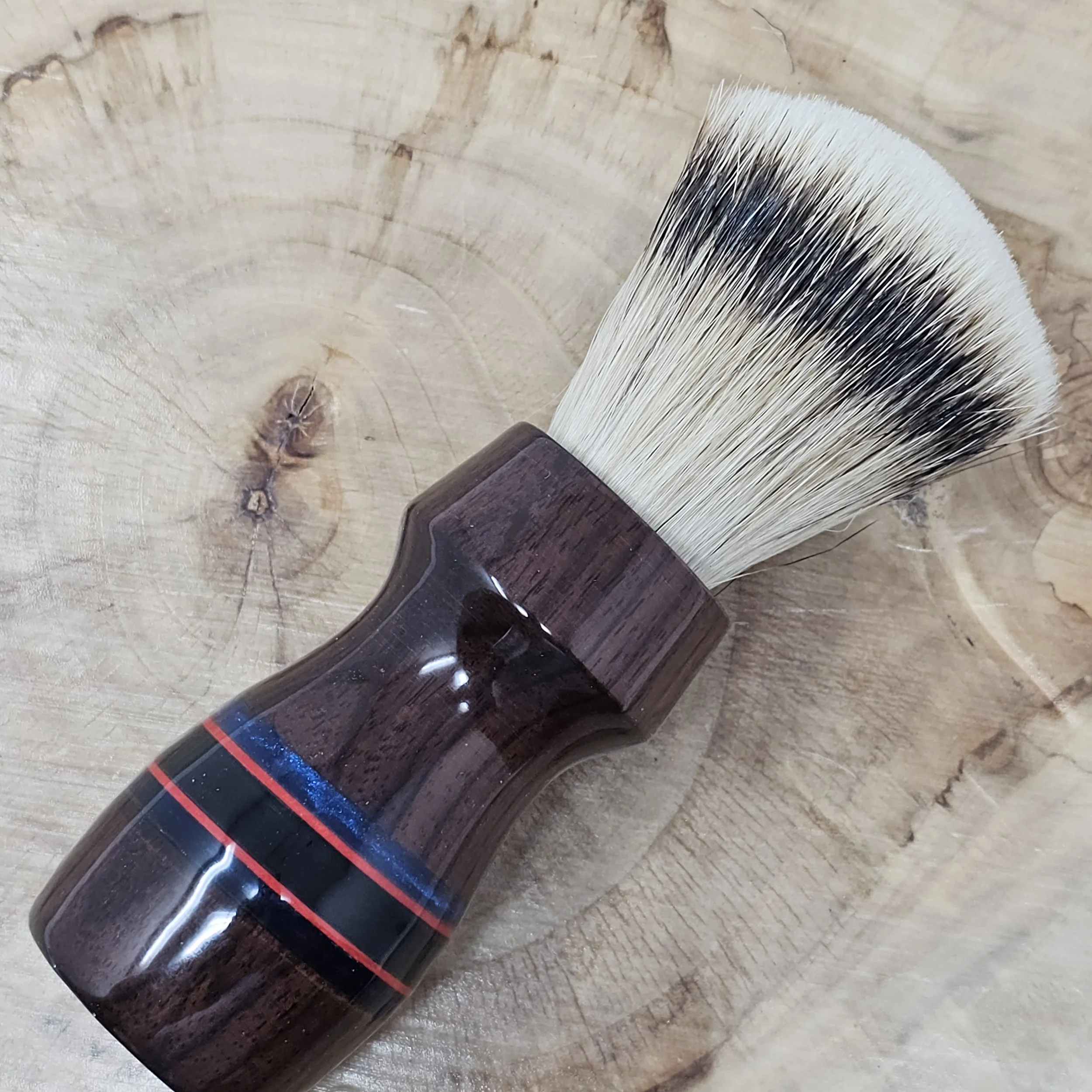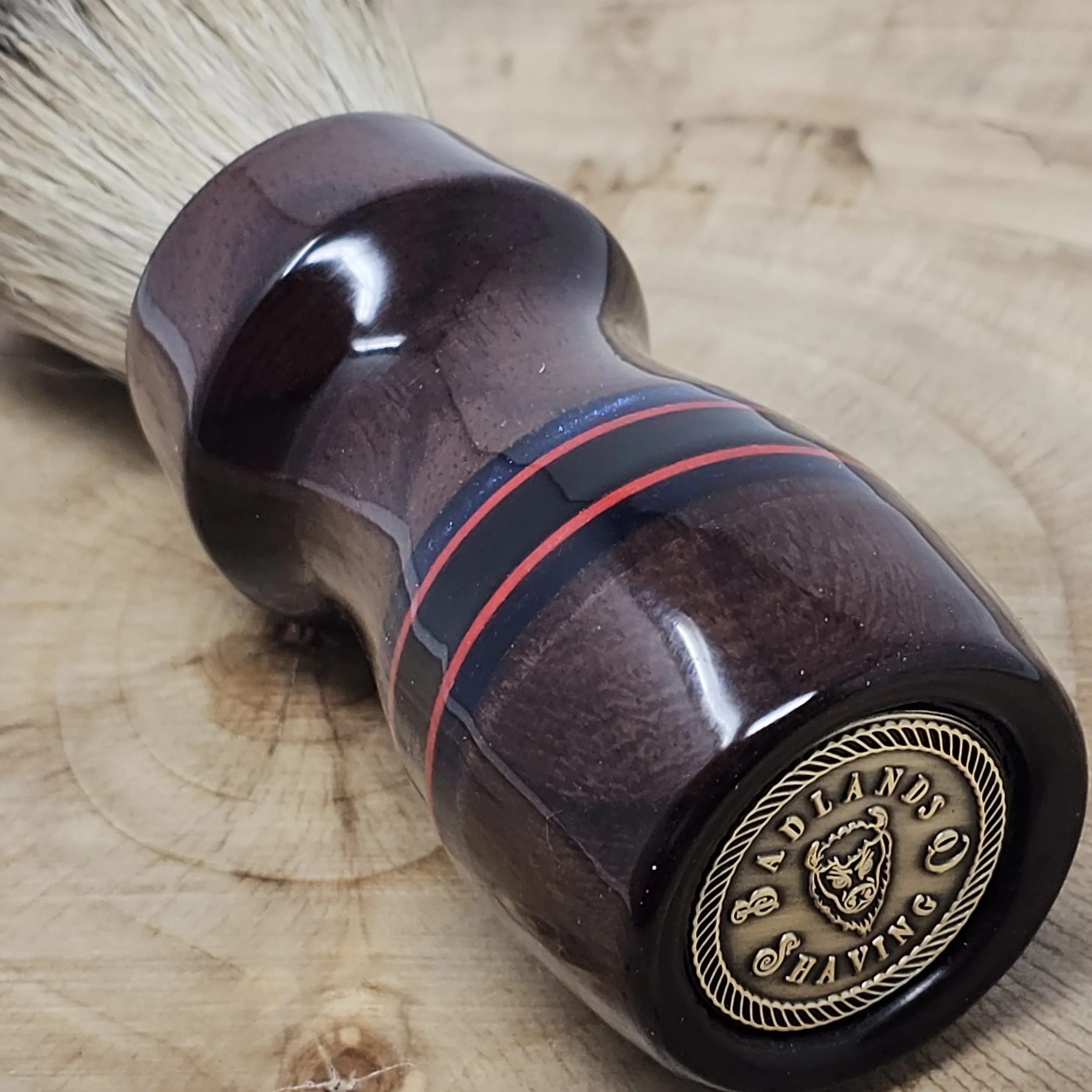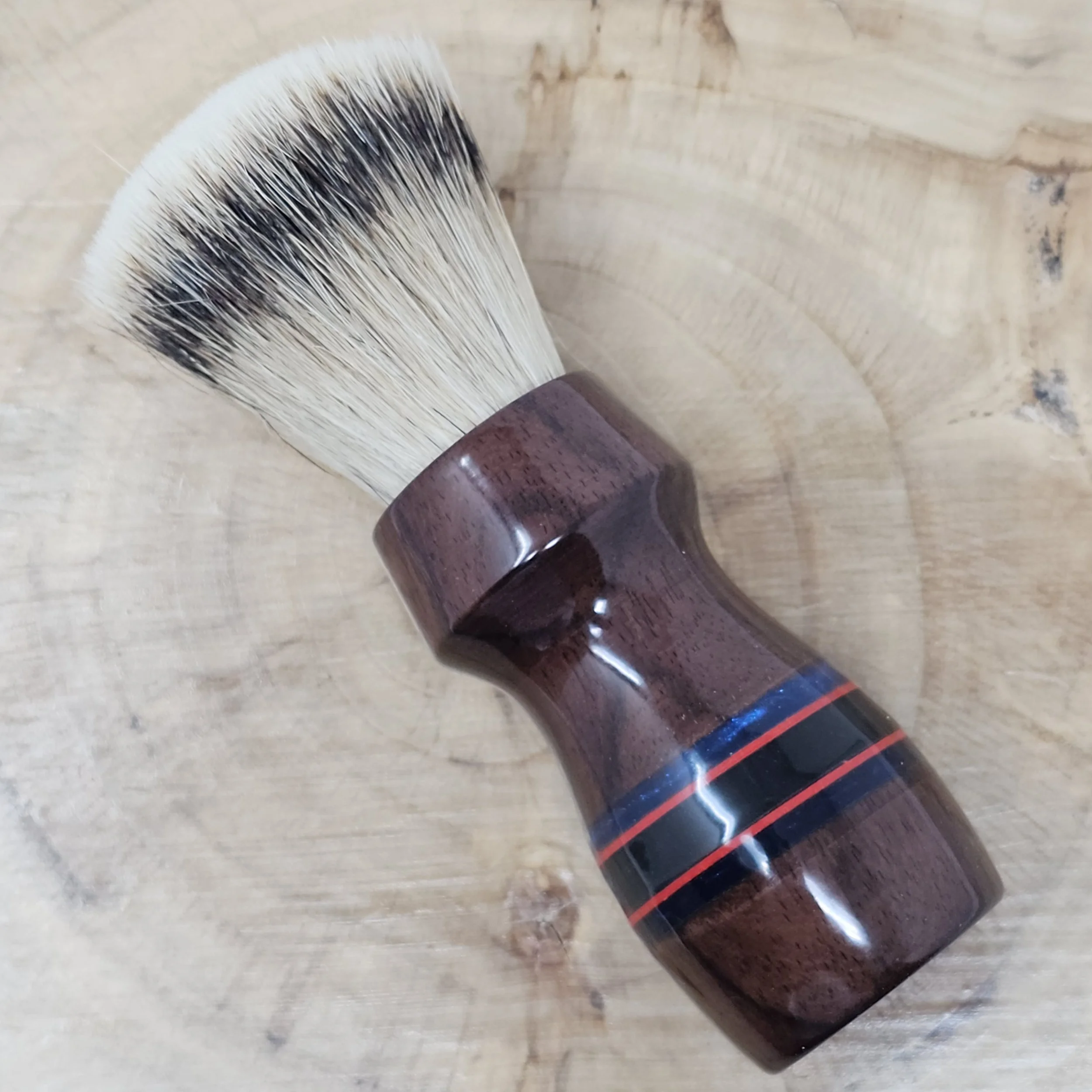 The Rosewood Renegade is a bold fusion of classic craftsmanship and striking modern detail. Handcrafted from rich Rosewood, this 26mm shaving brush showcases the wood’s deep, warm tones and natural grain patterns. Black, red, and blue striped inlays cut through the handle like racing lines, creating a dynamic contrast that makes this piece stand out on any shave den shelf.