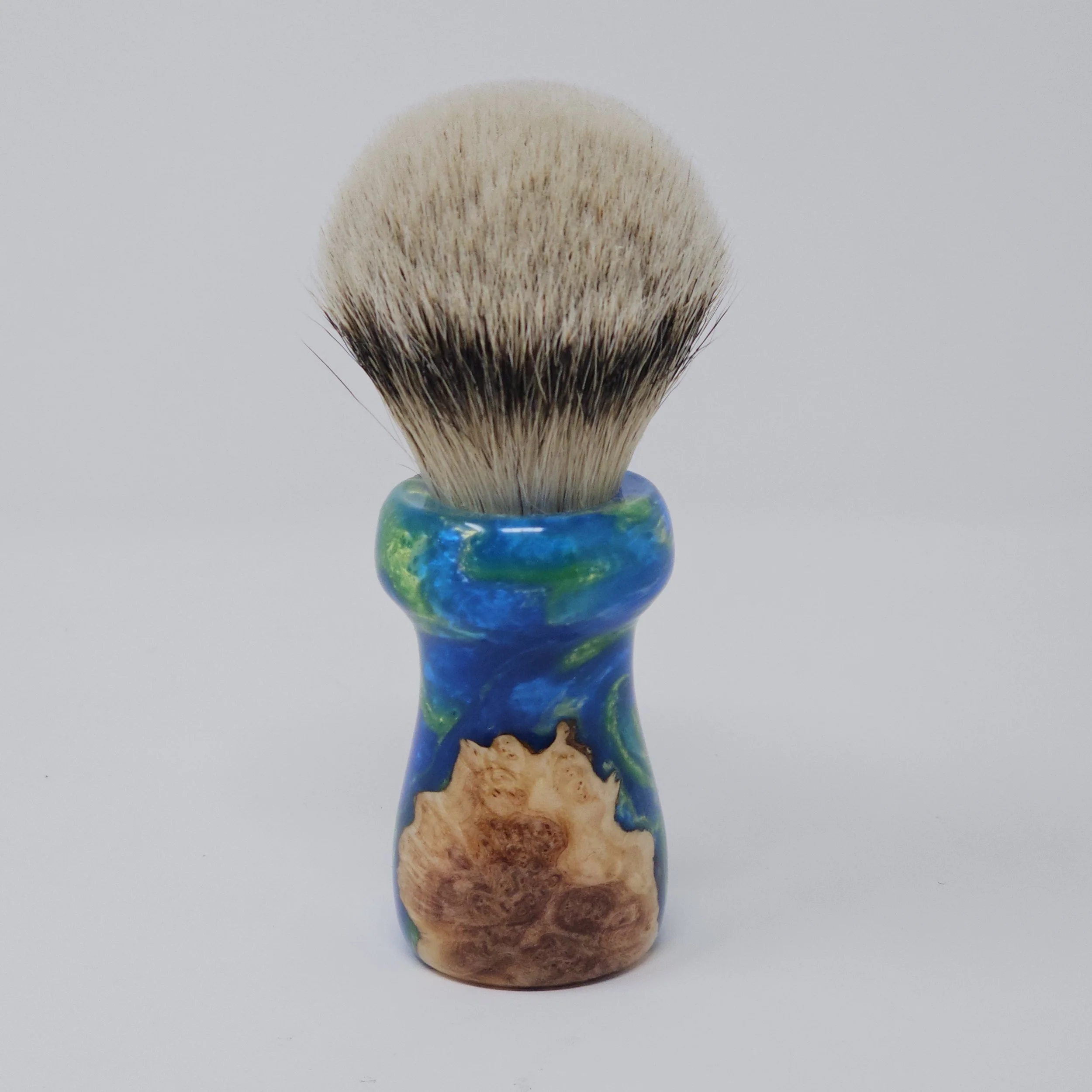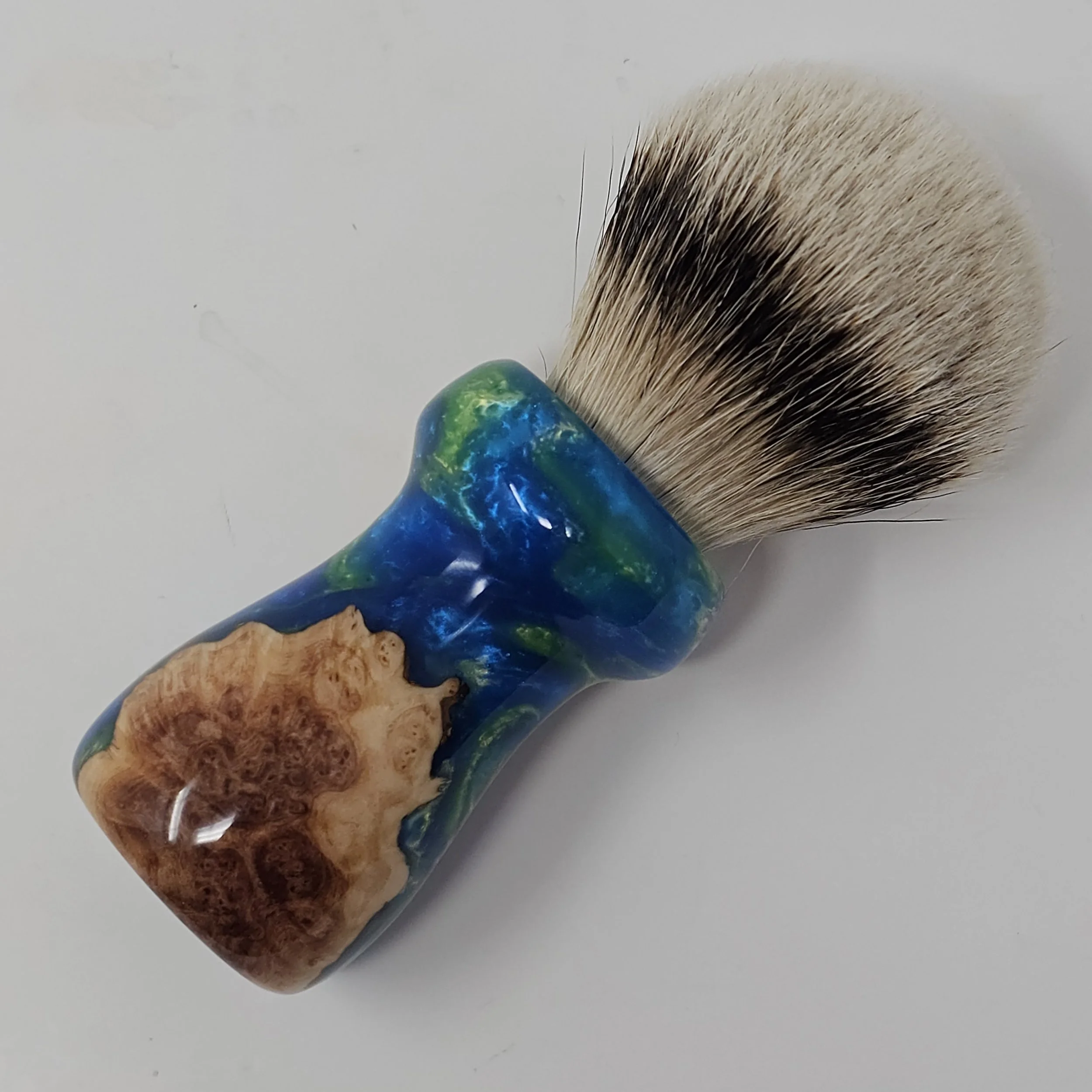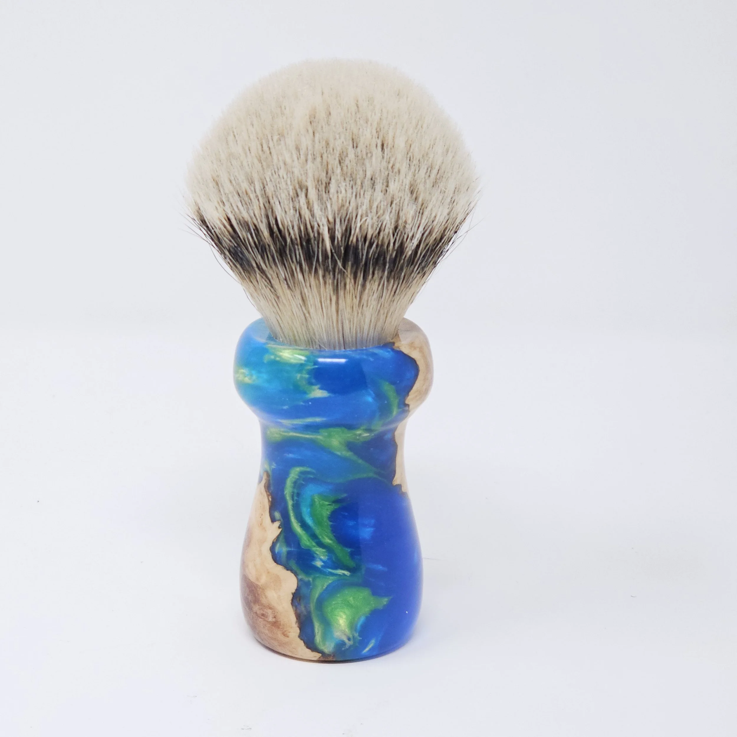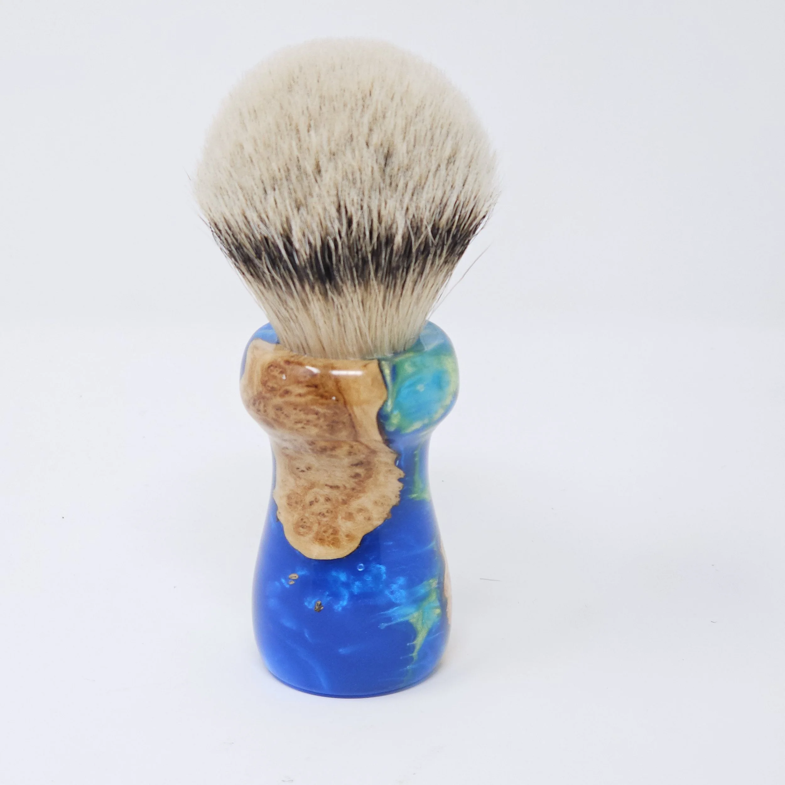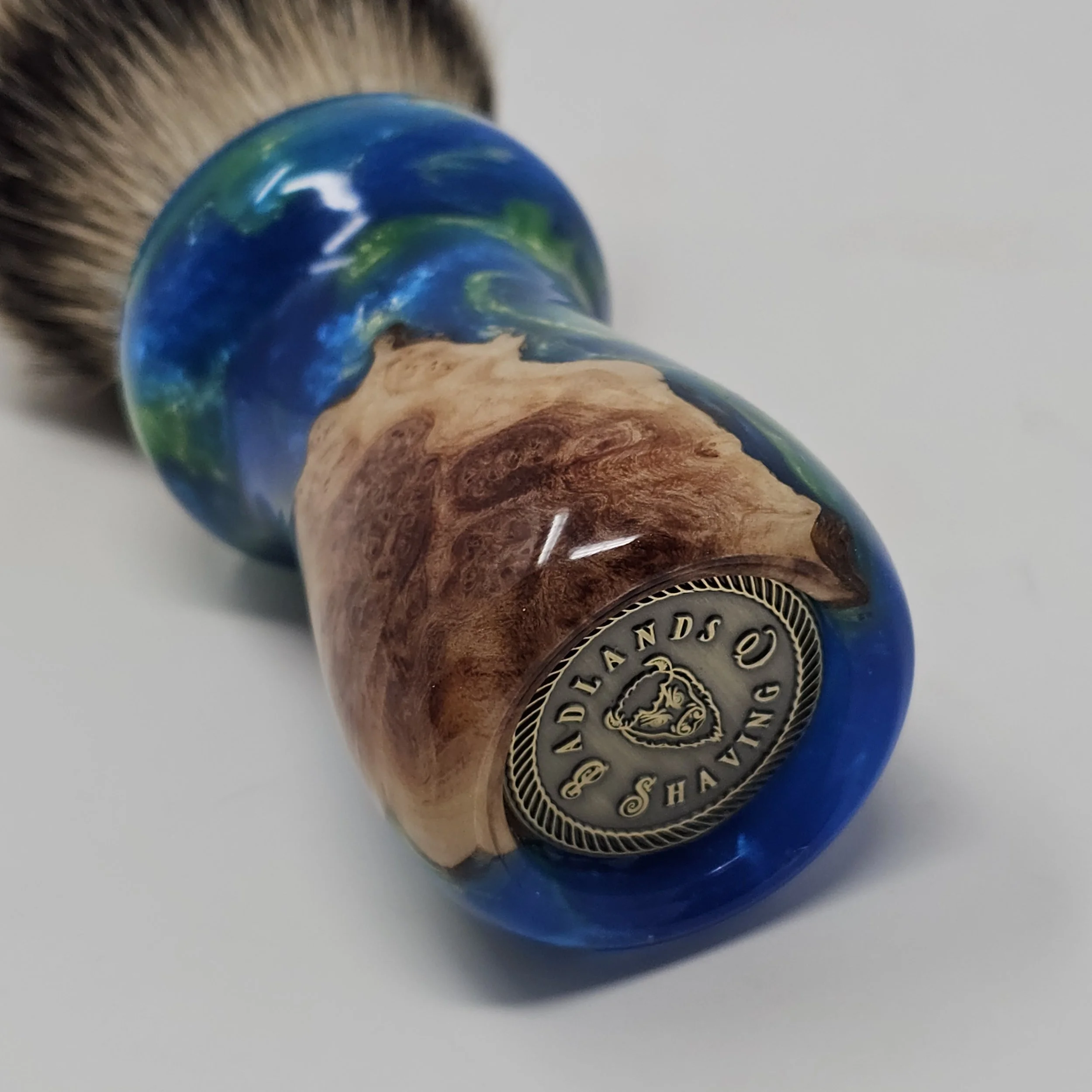The Outback Tide shaving brush brings together the rugged beauty of the Australian bush and the fluid motion of the sea. Crafted from striking Australian Red Mallee Burl wood, this handle is accented with rich blue resin infused with subtle green swirls, creating a vivid contrast that highlights the burl’s natural grain and character.