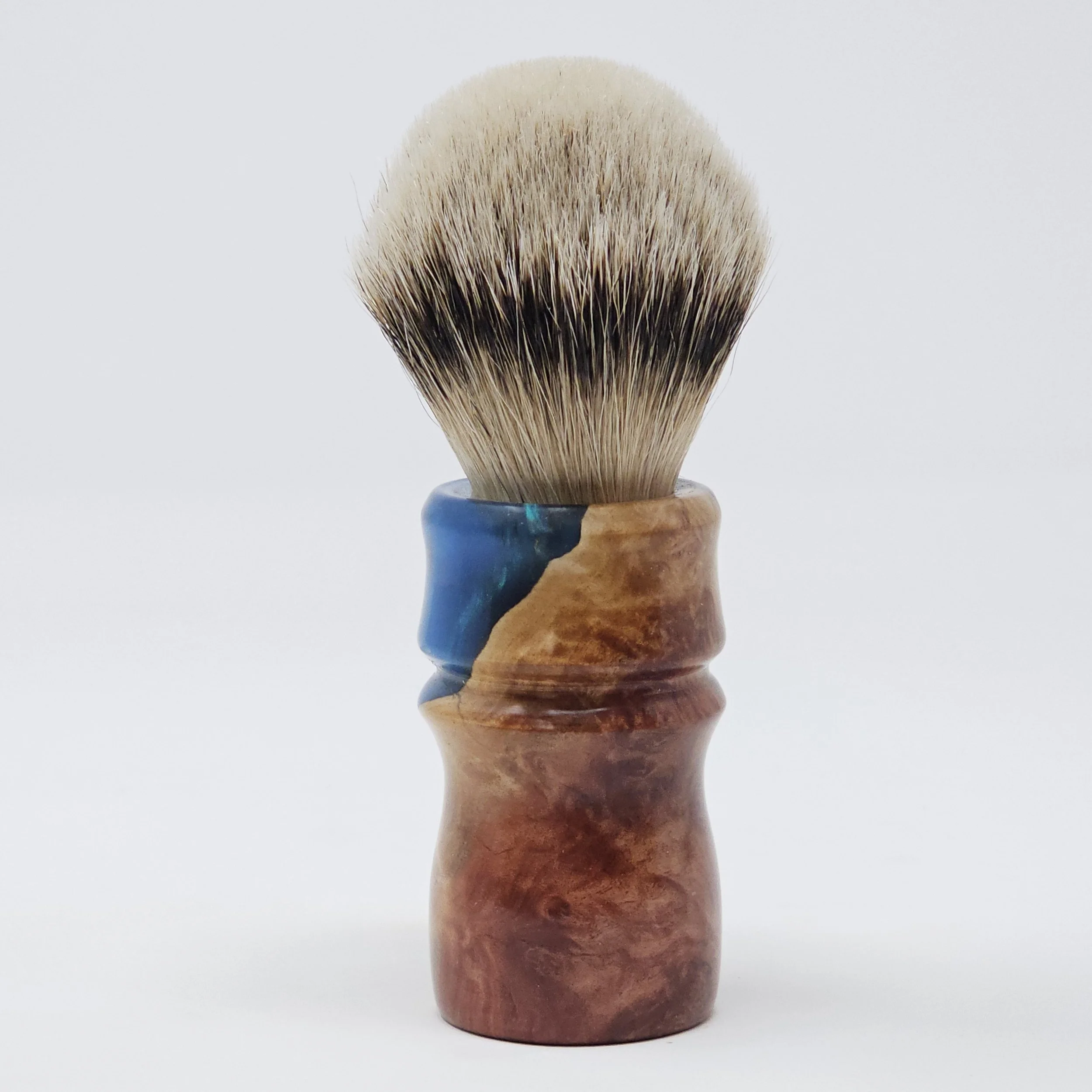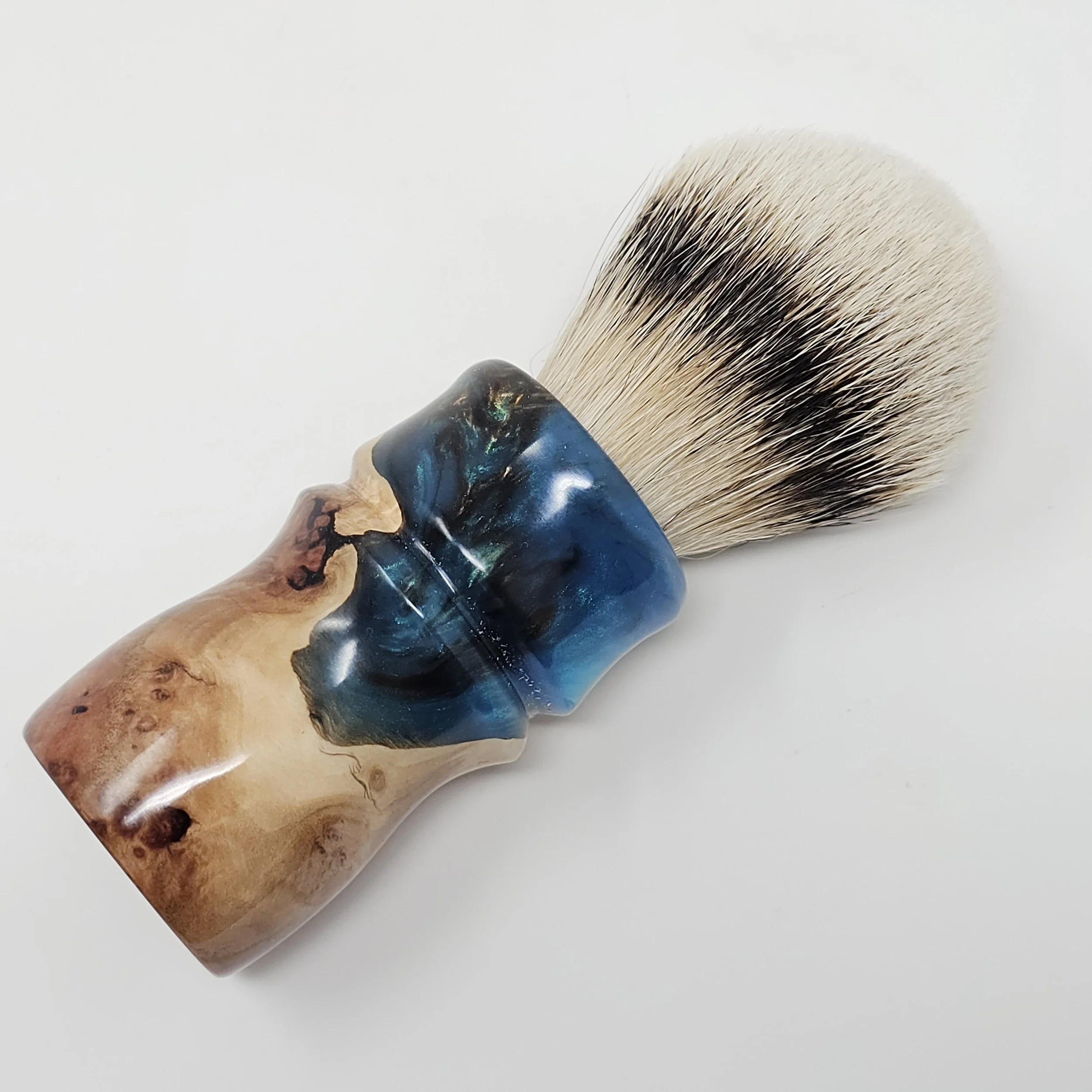 Handcrafted in the USA, this one-of-a-kind 26mm shaving brush is a true functional work of art. The handle is made from Australian Red Mallee Burl, a rare and highly figured hardwood prized for its dramatic grain and natural depth. It is expertly combined with premium epoxy resin, creating a striking visual effect reminiscent of iridescent peacock feathers—rich blues, greens, and shimmering highlights that shift beautifully in the light.