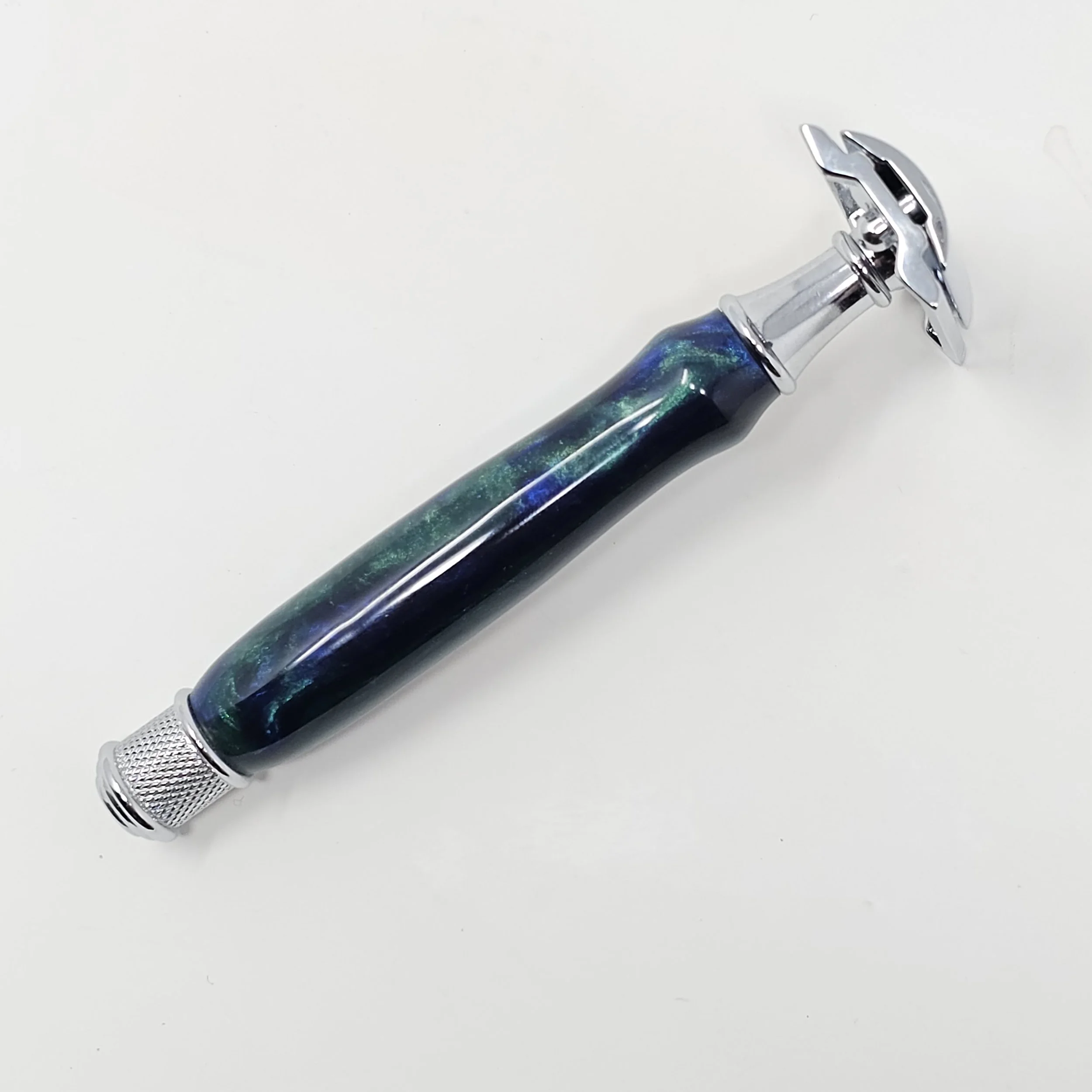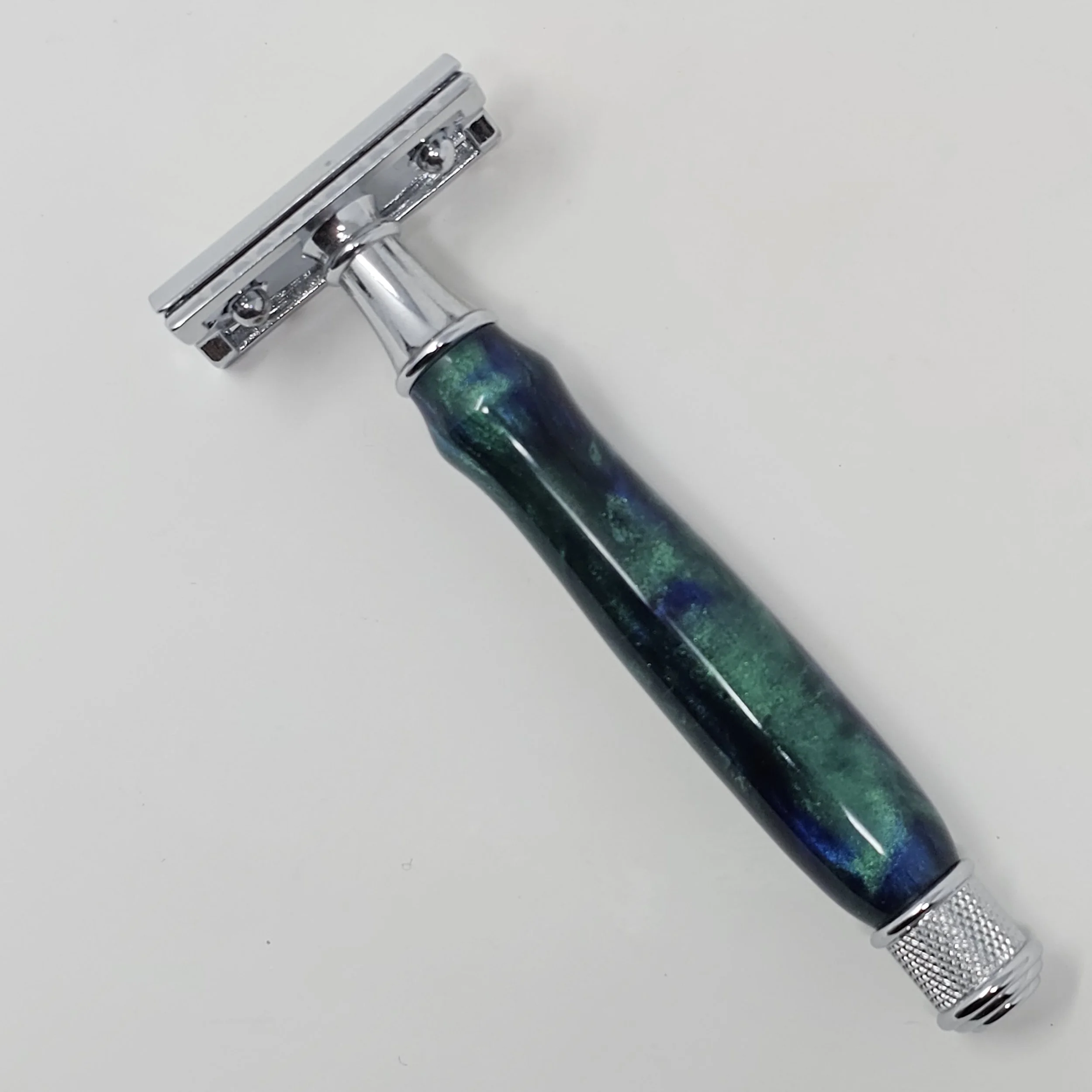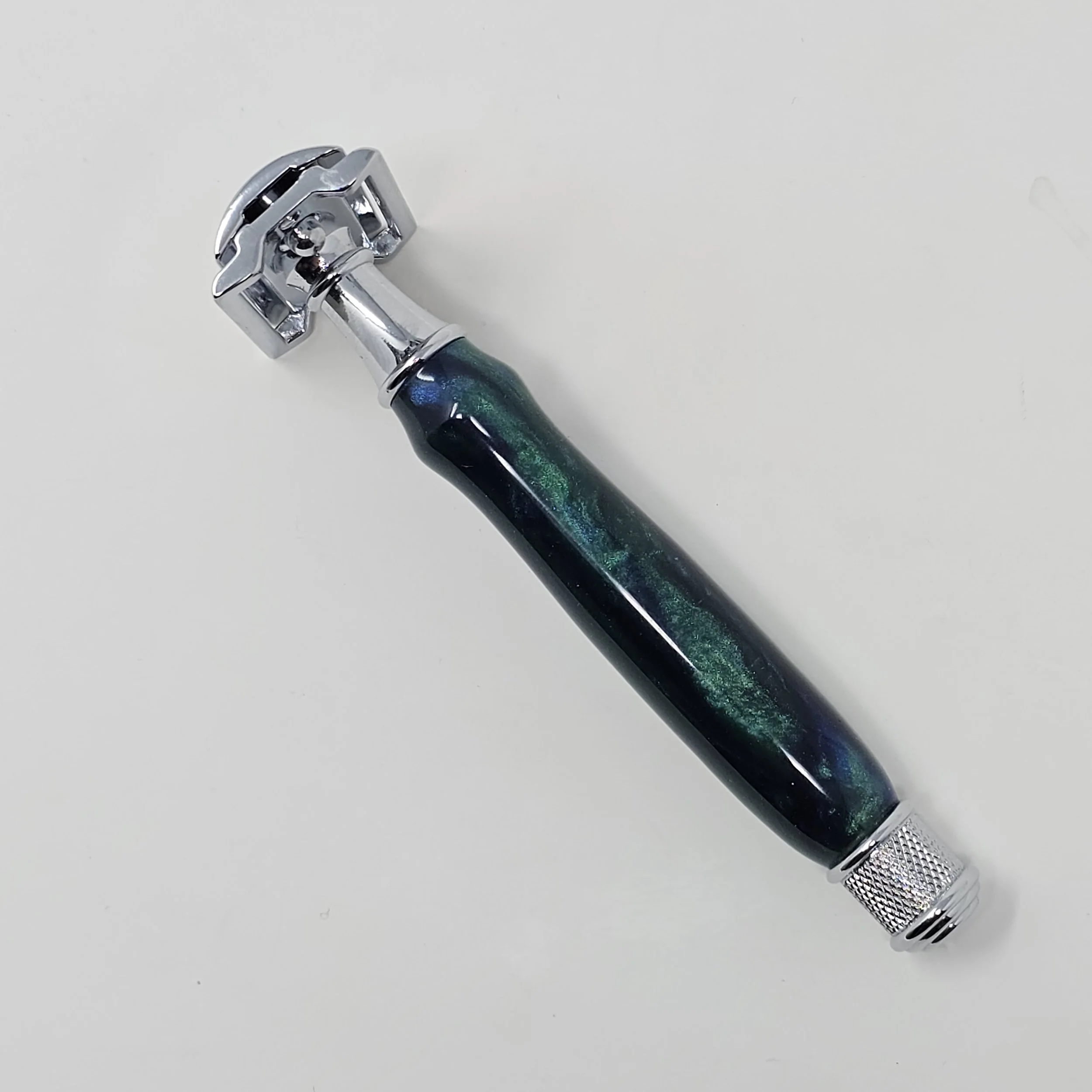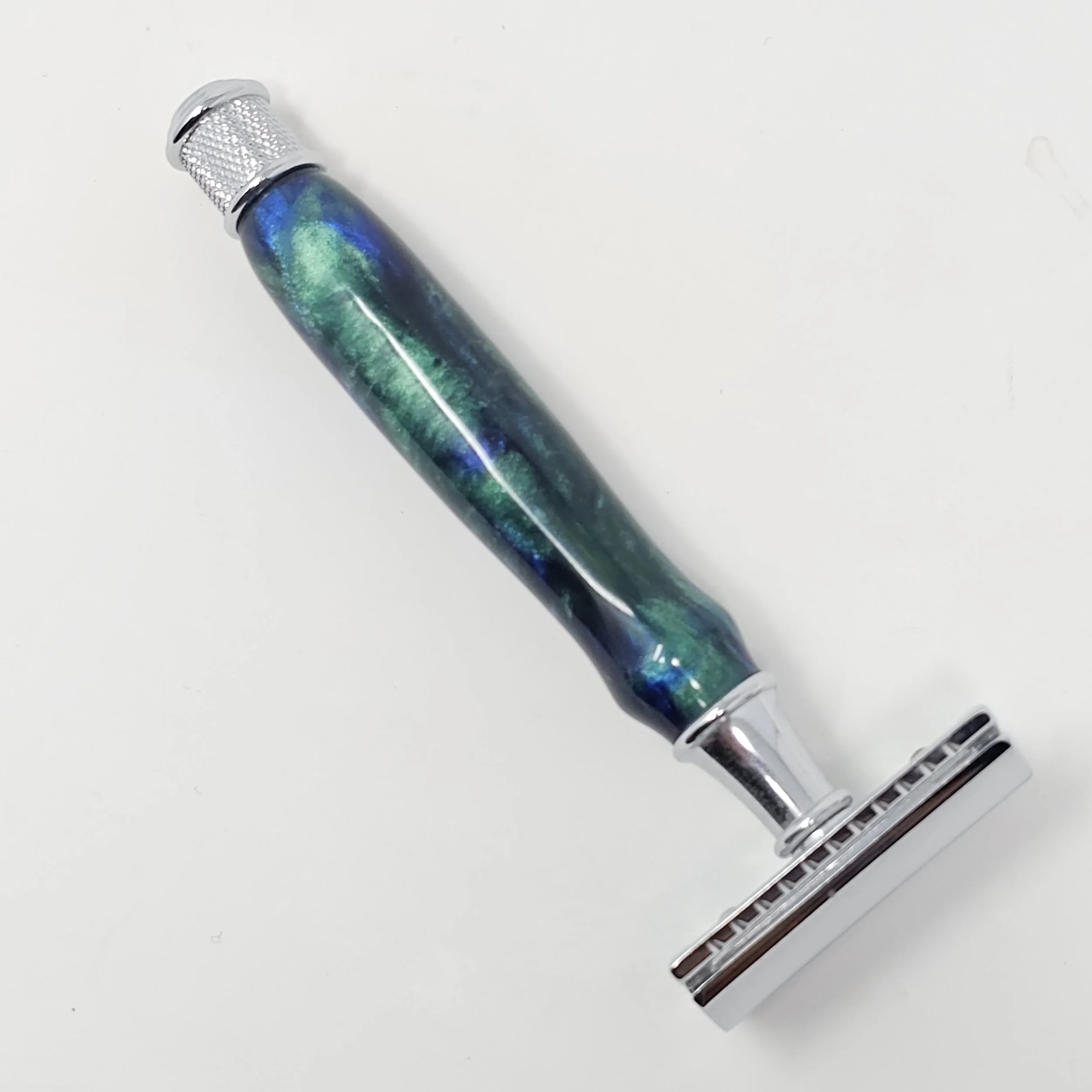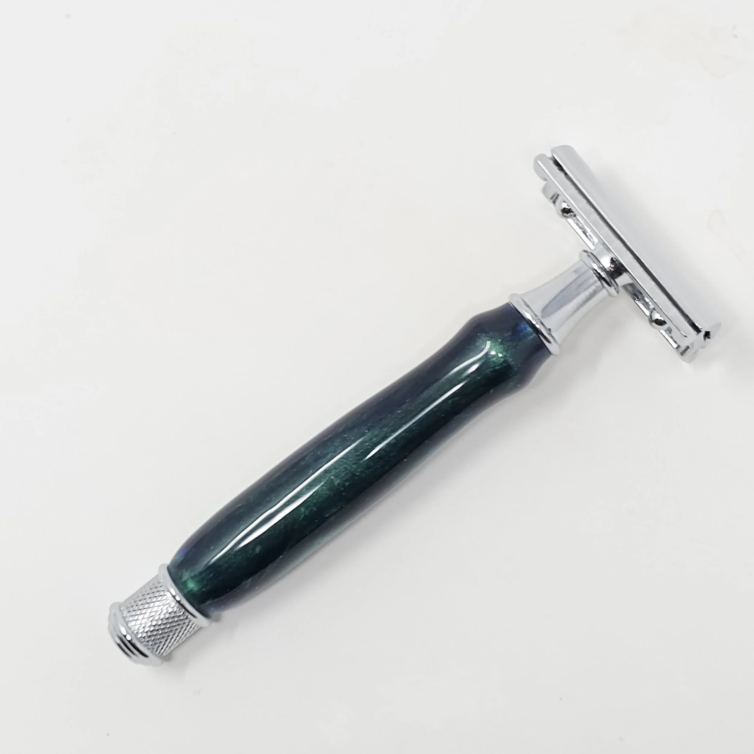 The razor was turned on a lathe and carefully sanded down and finished with CA (super glue), which provides a very glossy and durable finish. It is the only finish that will hold up to using in water every day.