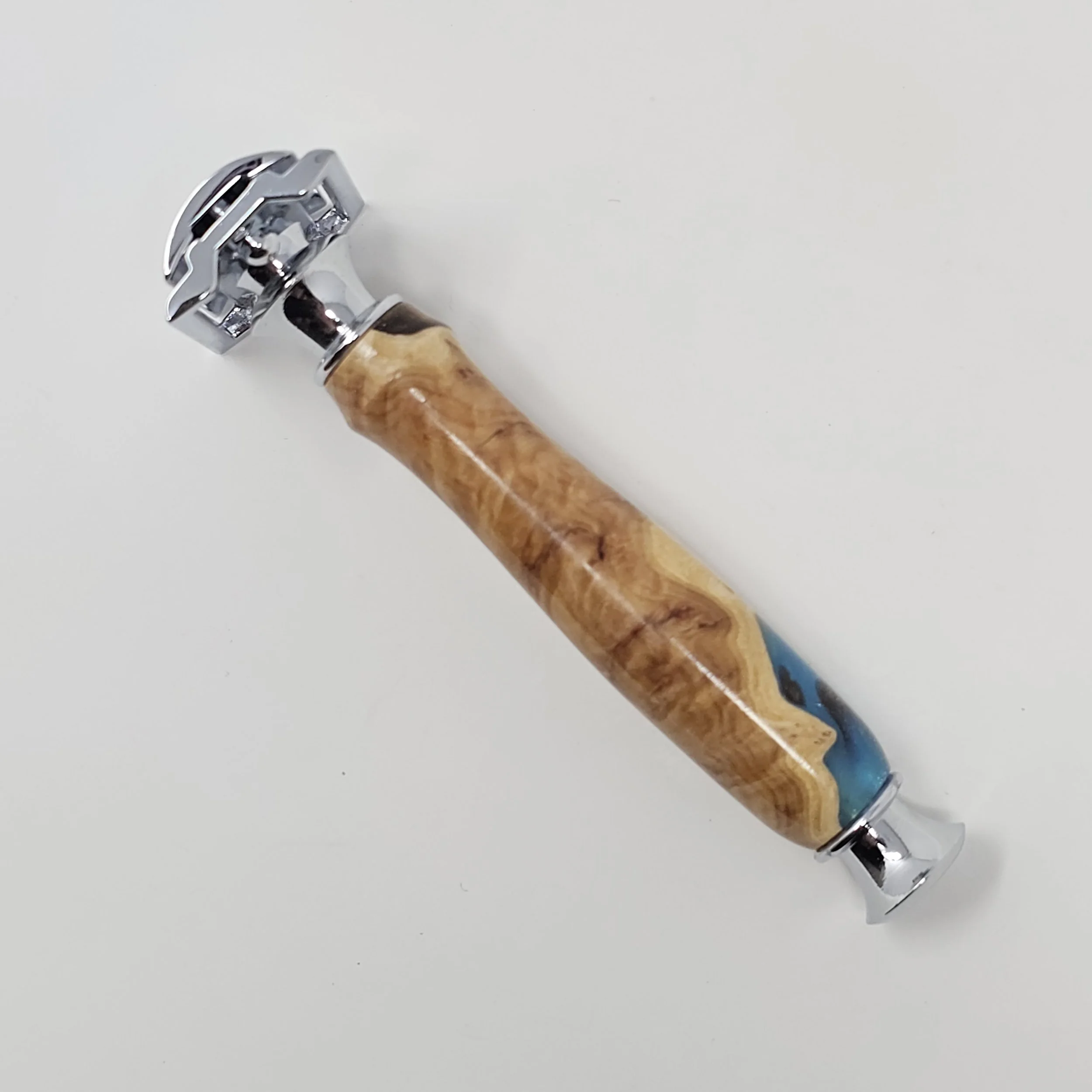 Double Edge Safety razor from a beautiful piece of Red Mallee burl wood from Australia and mixed with beautiful blue and brown swirled resin.