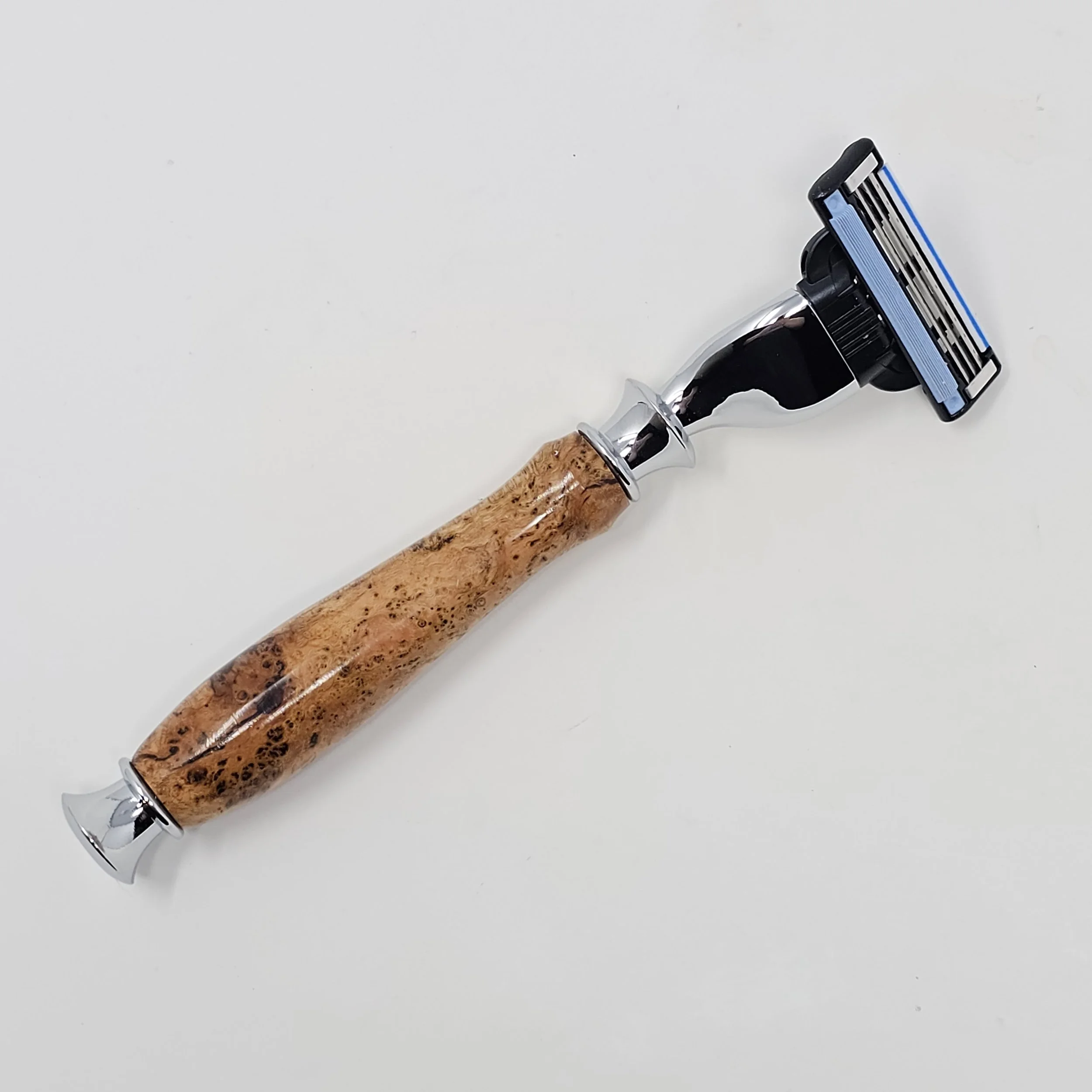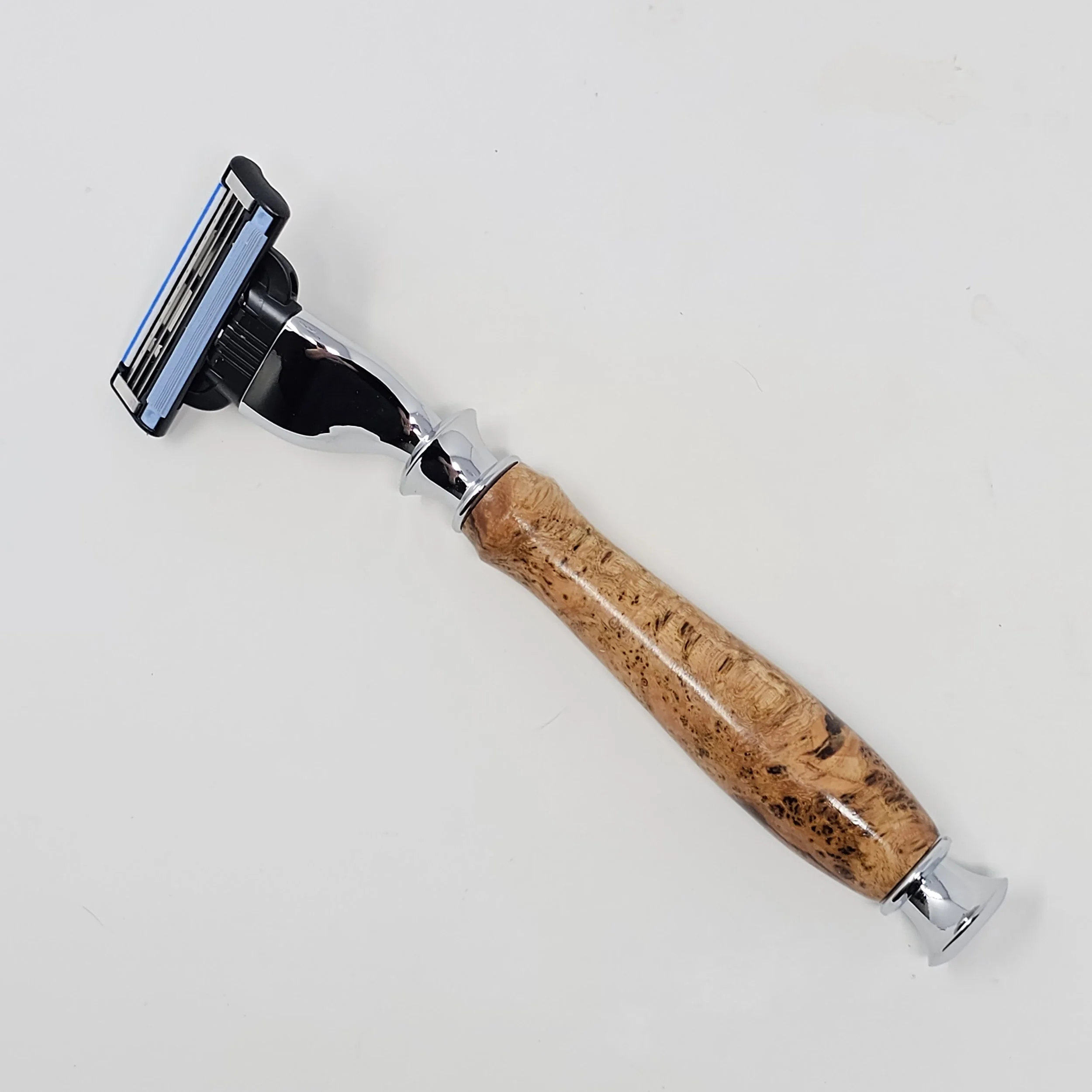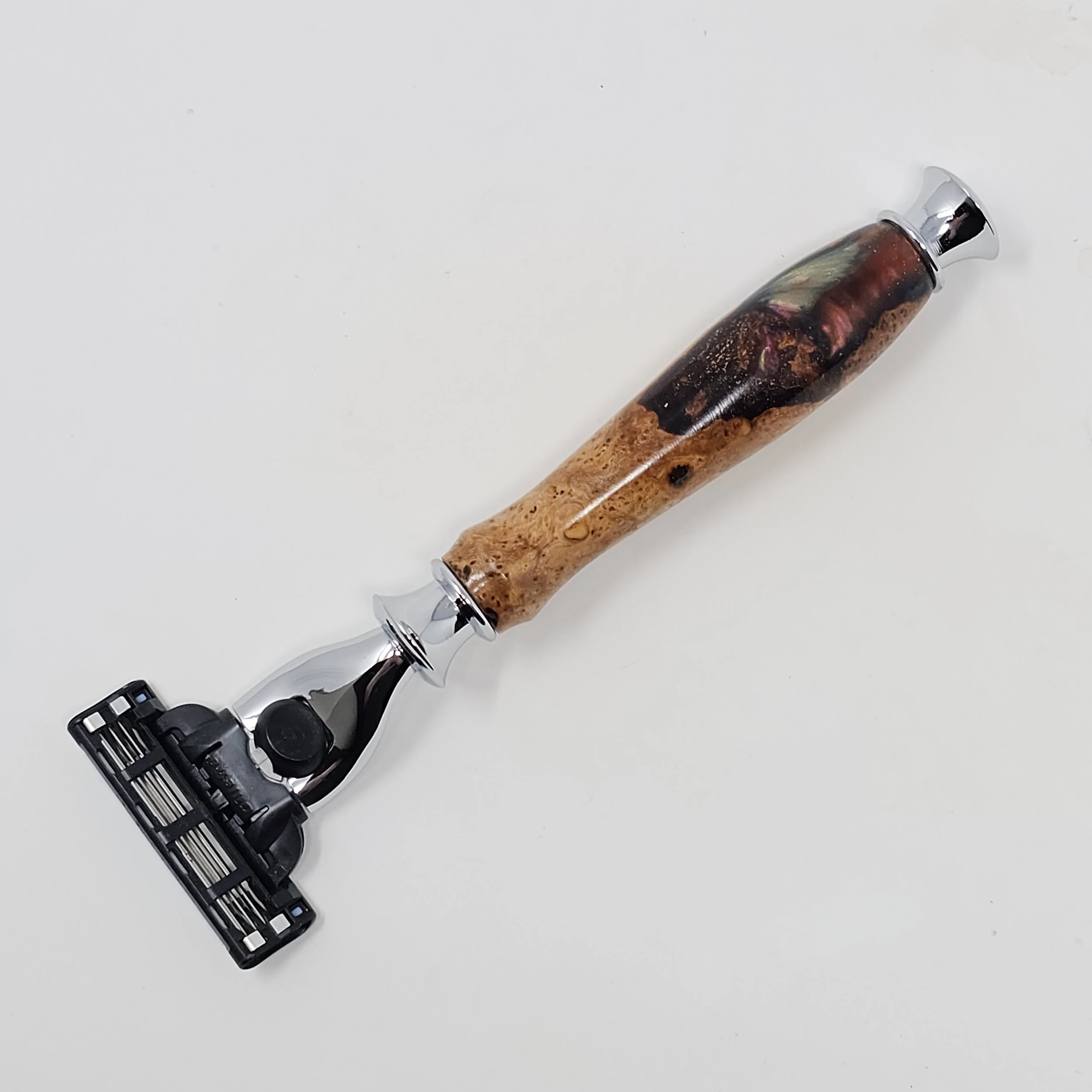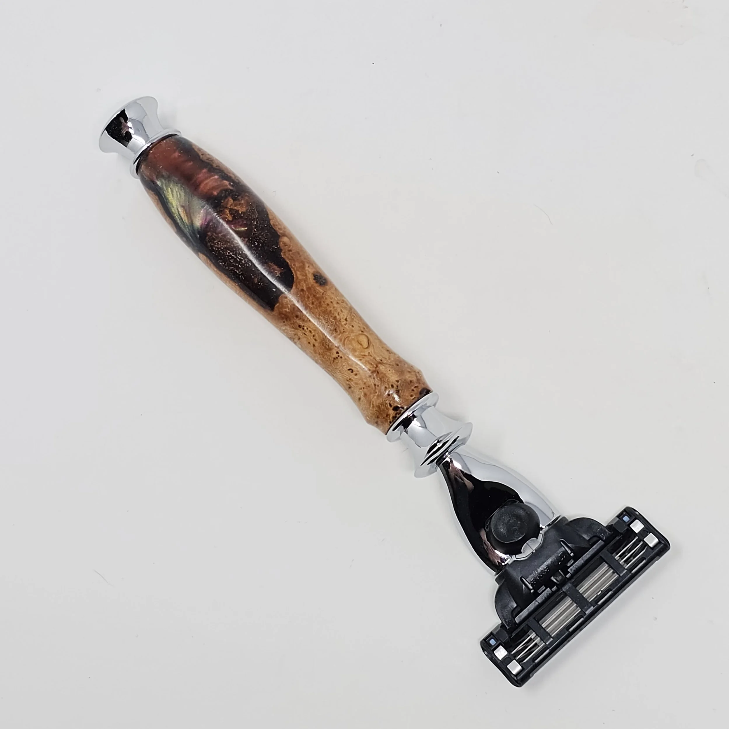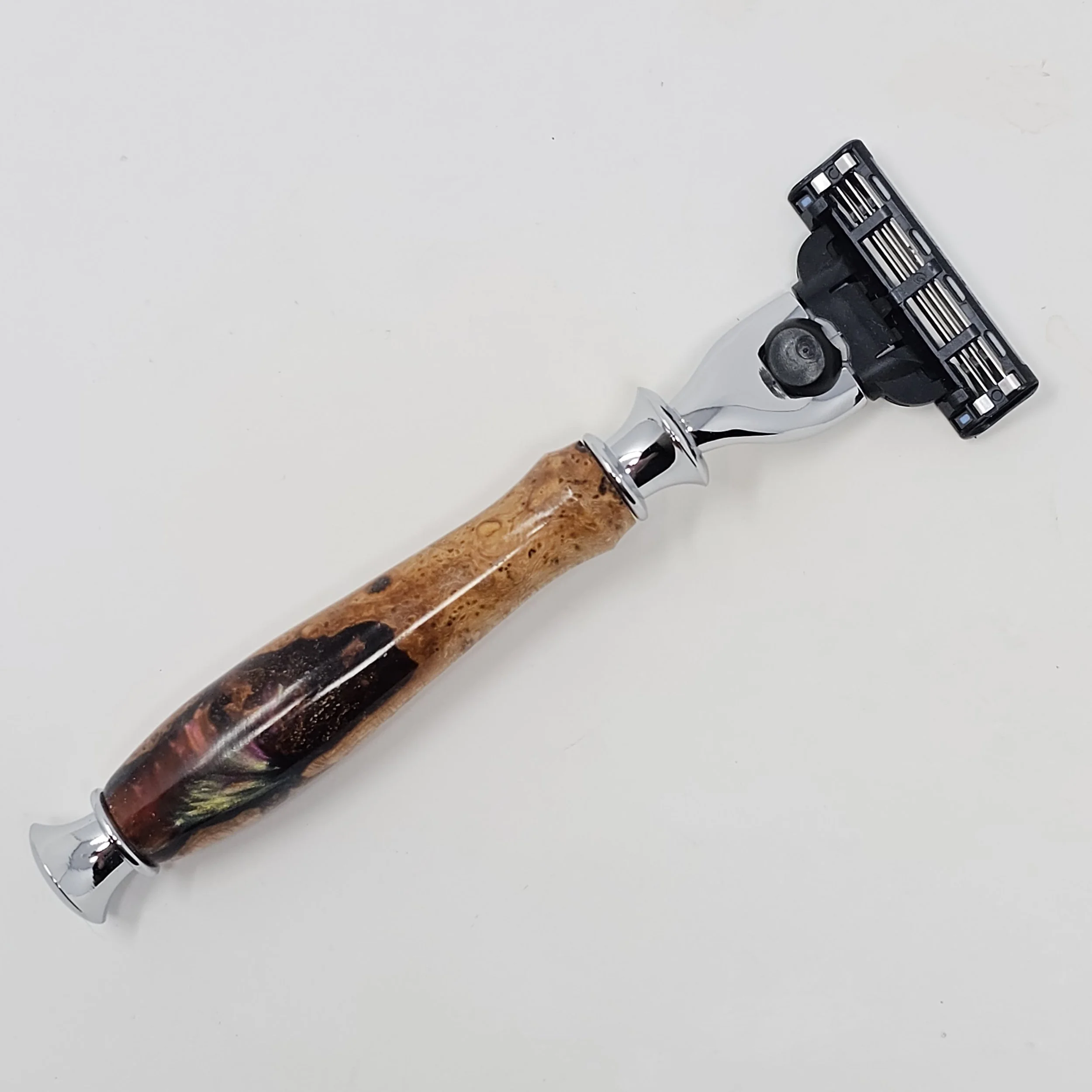 Razor made from Australian Red Mallee Burl combined with multi-colored resin. The razor head will fit Gillette Venus or Mach 3 blades.