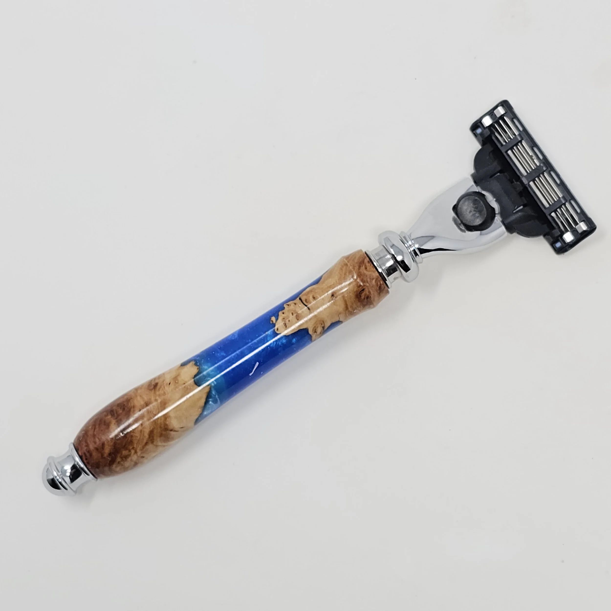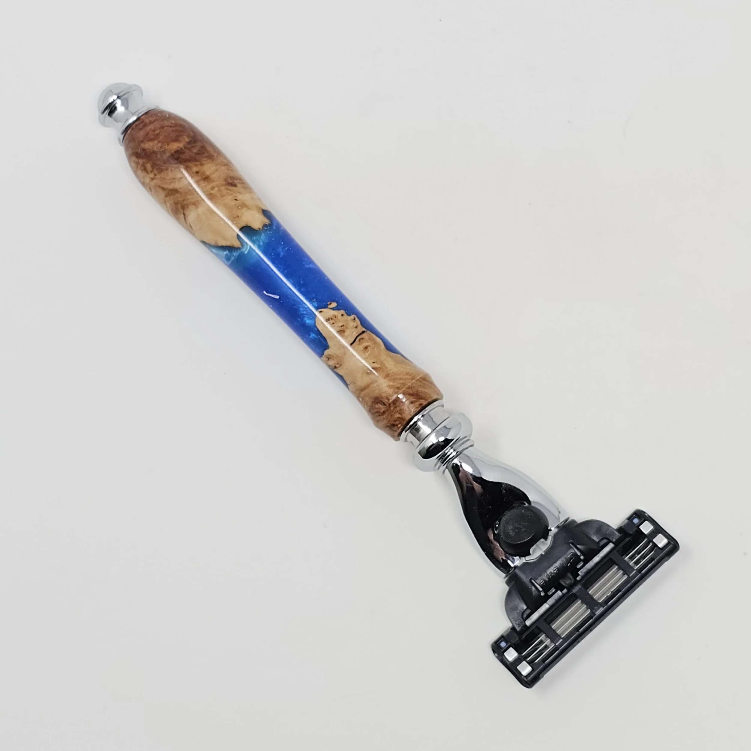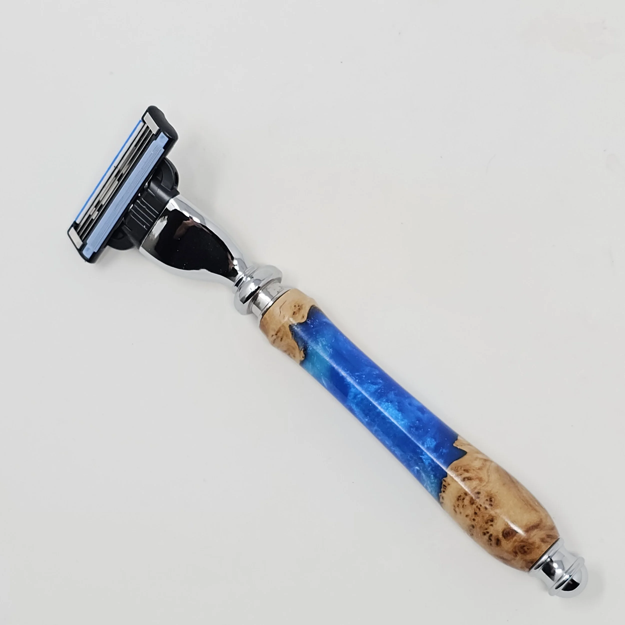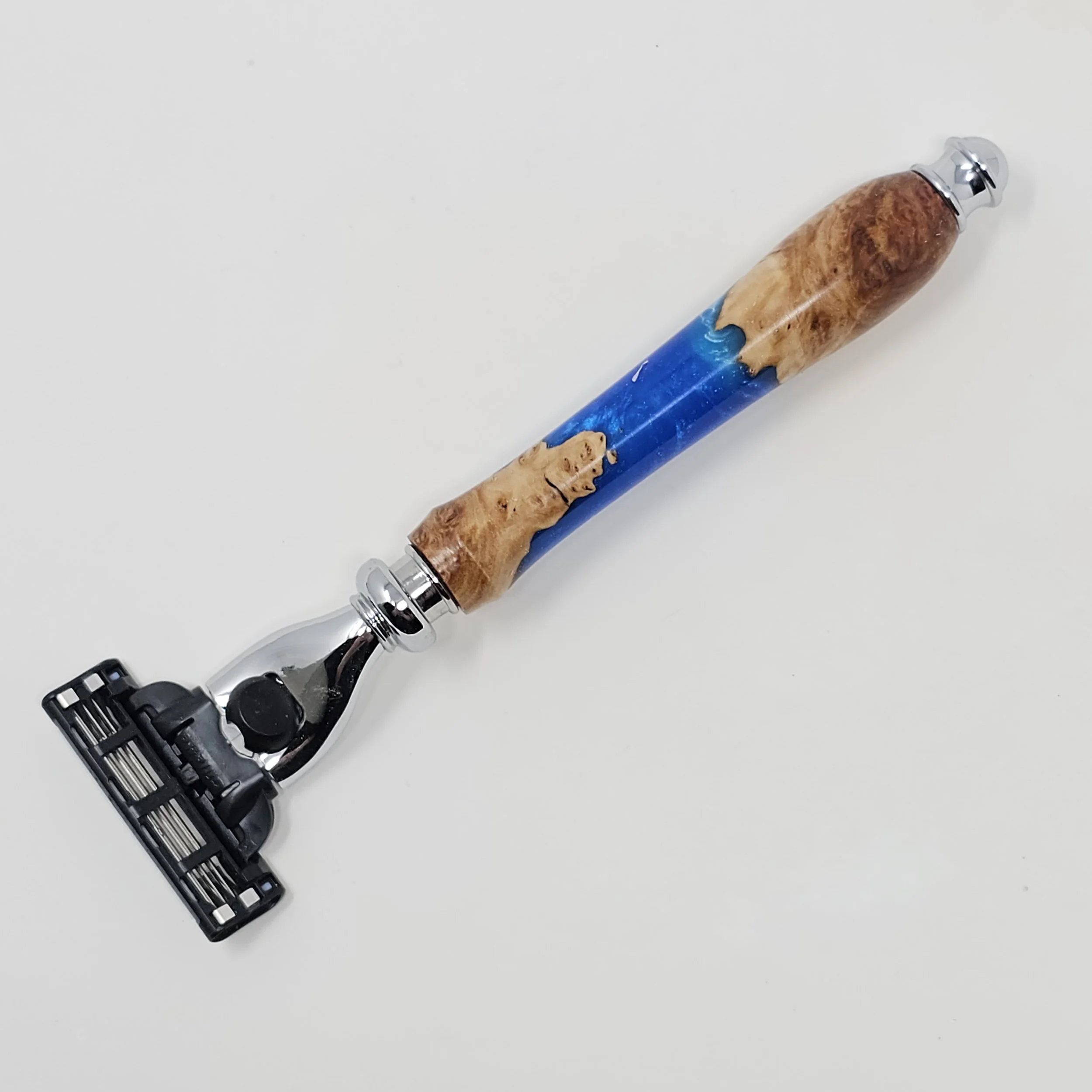 Razor made from Australian Red Mallee Burl combined with blue resin. The razor head will fit Gillette Venus or Mach 3 blades.