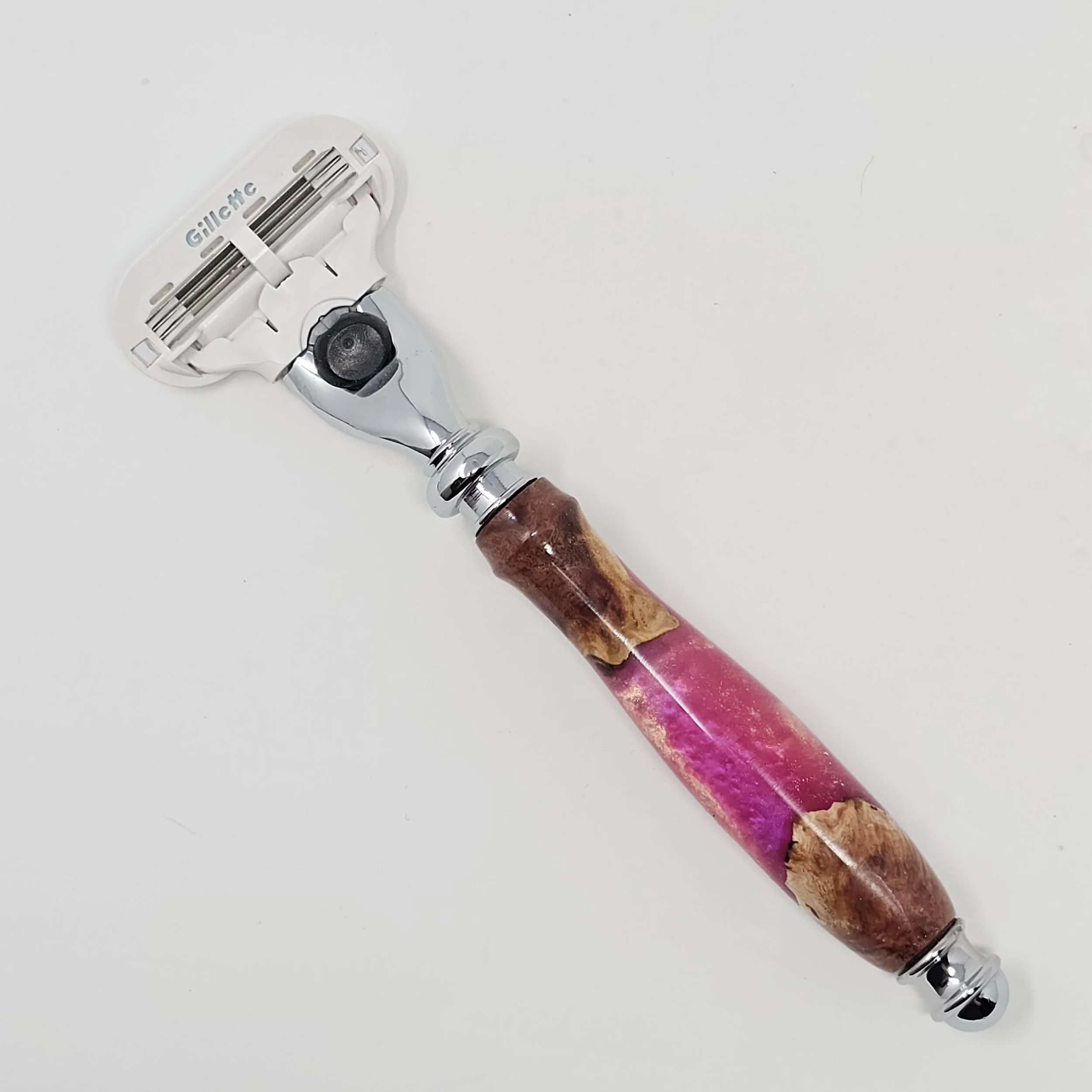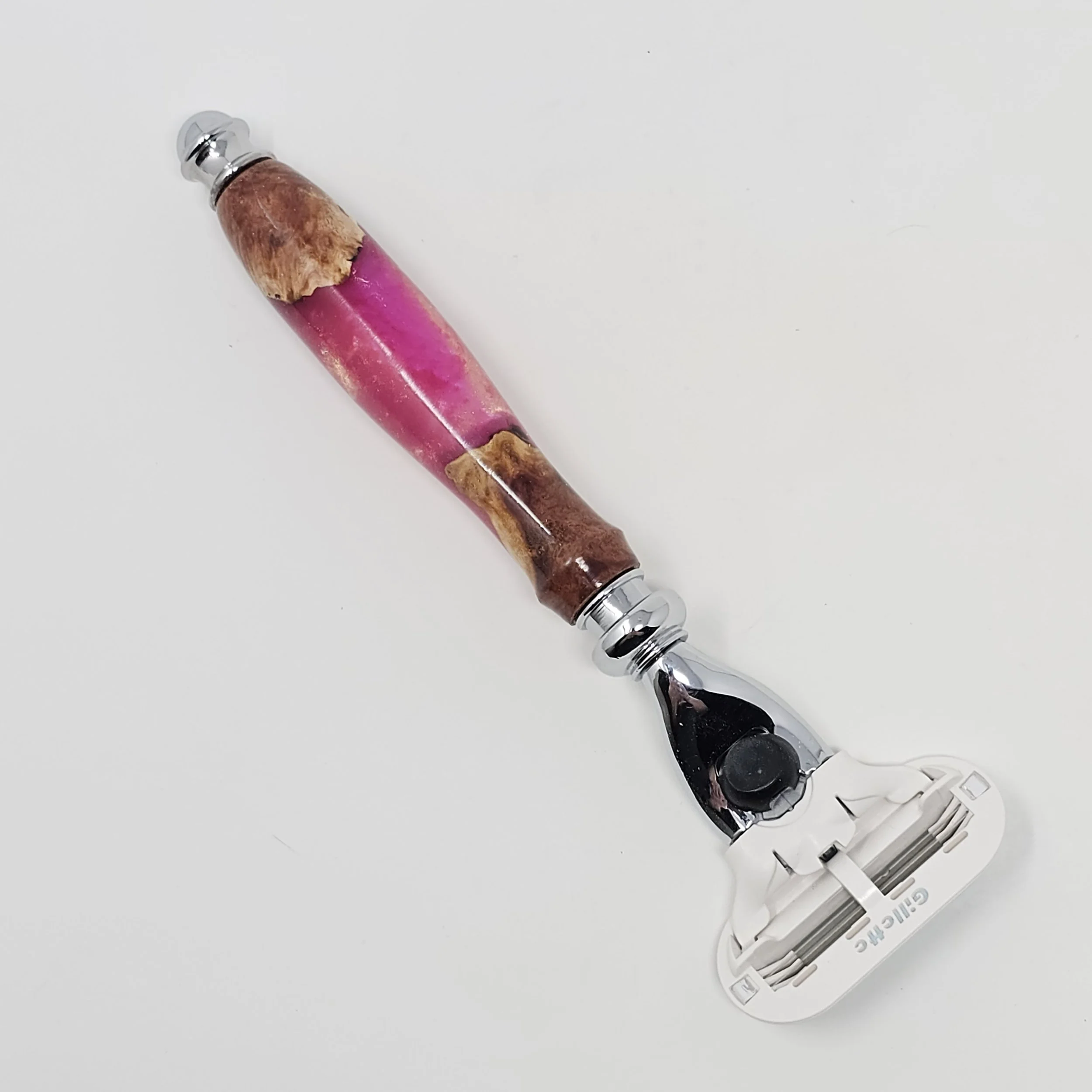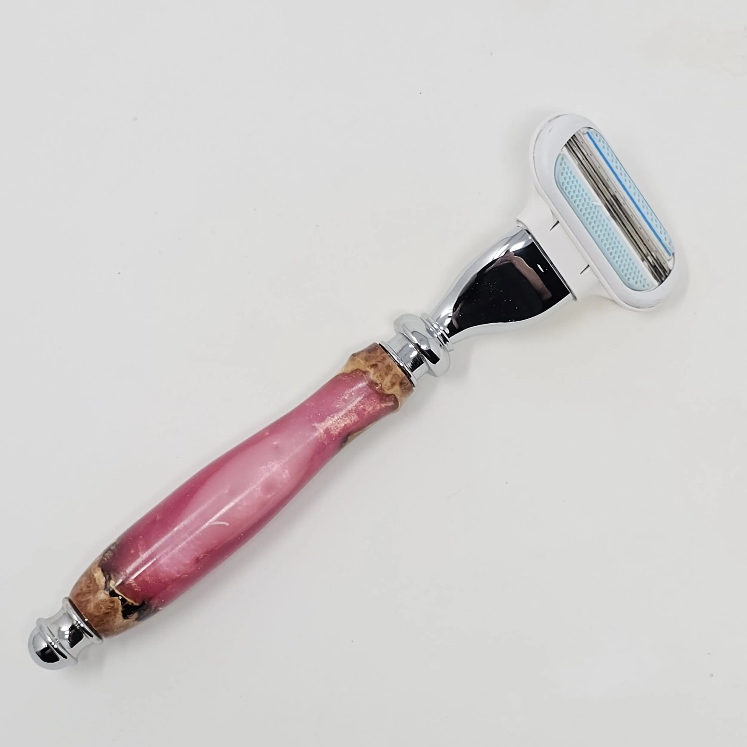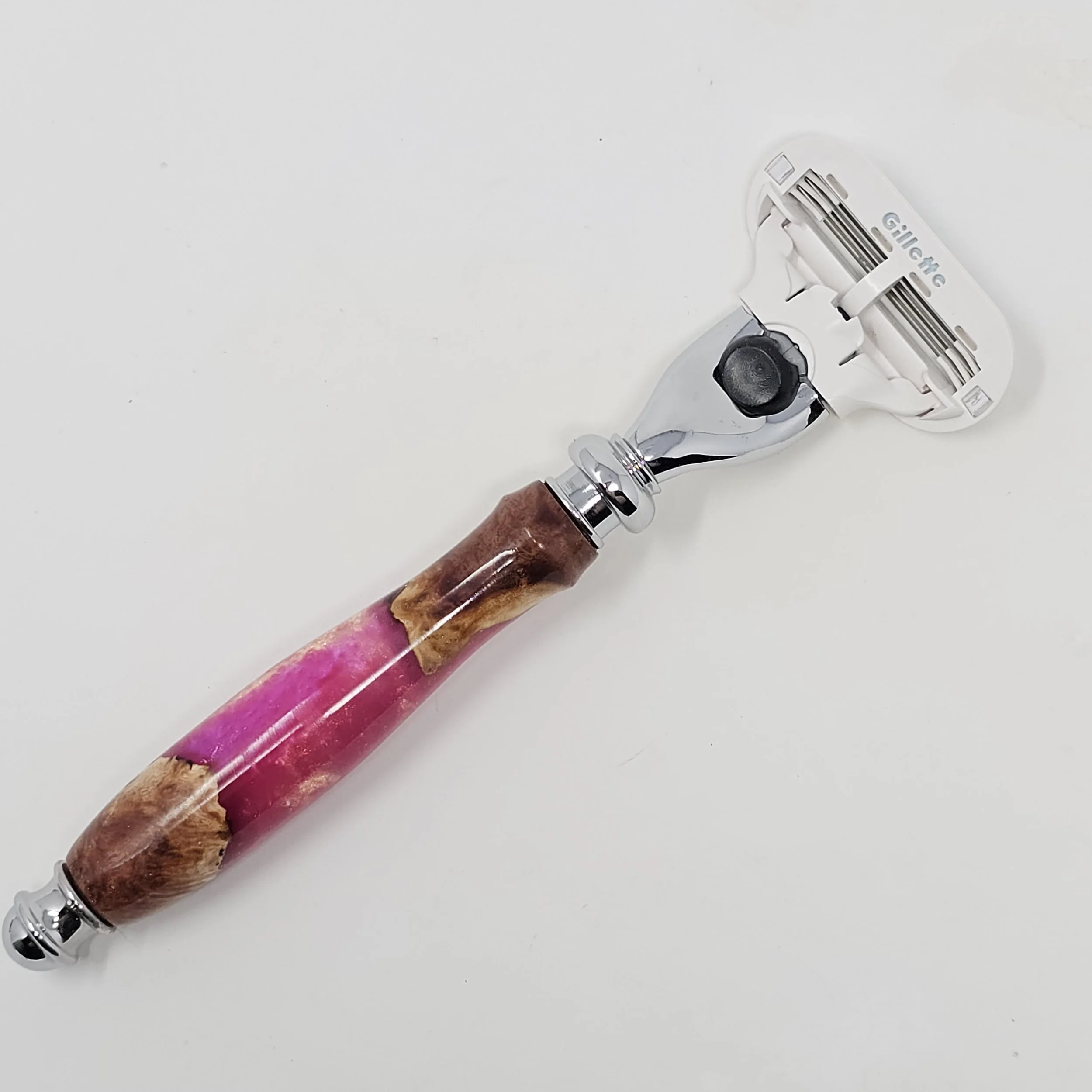 Razor made from Australian Red Mallee Burl combined with pink resin. The razor head will fit Gillette Venus or Mach 3 blades.