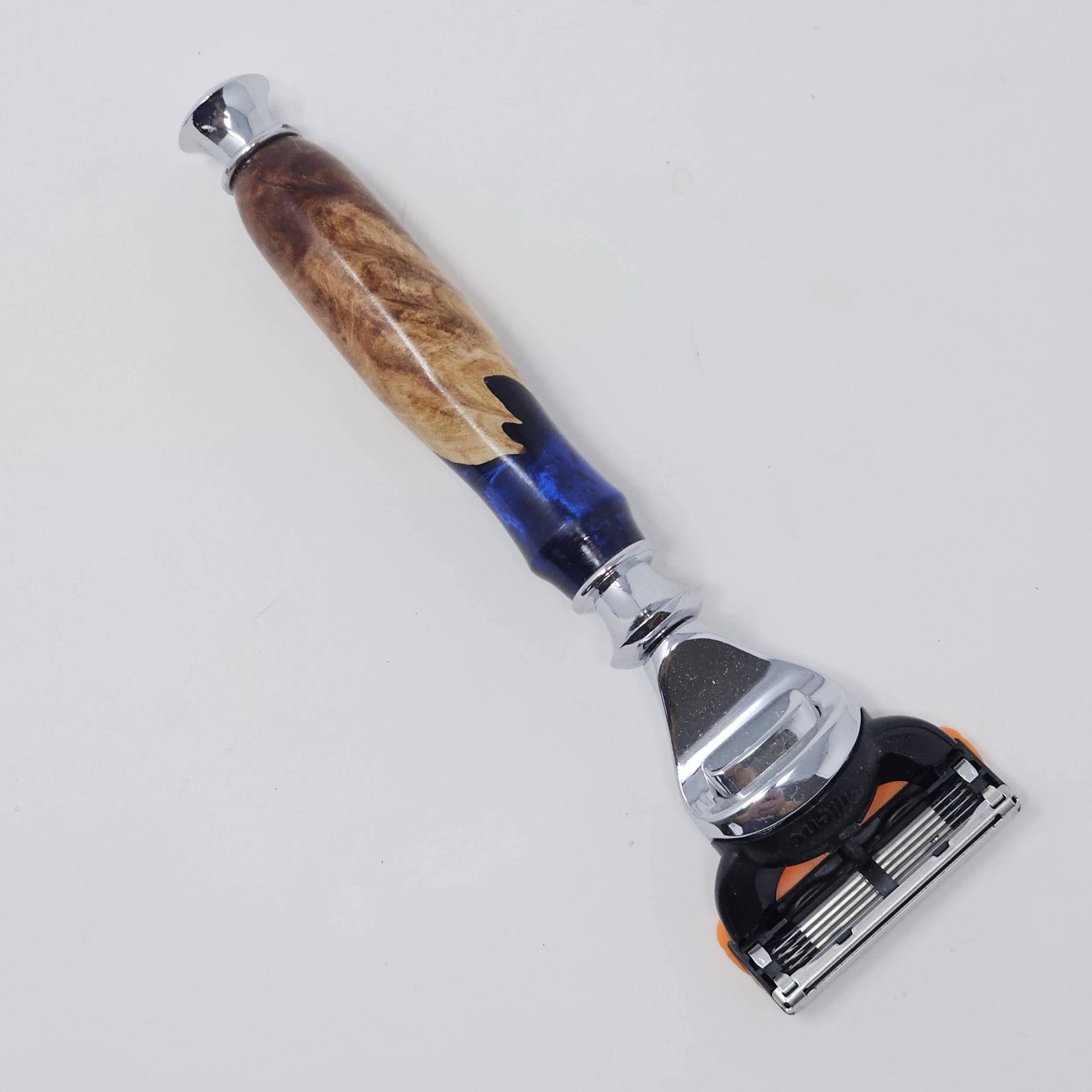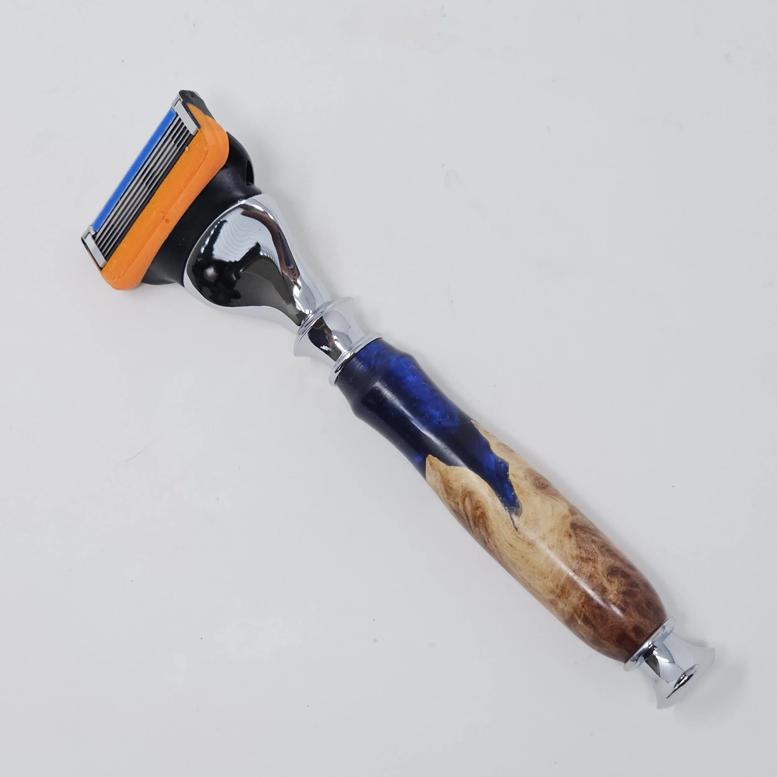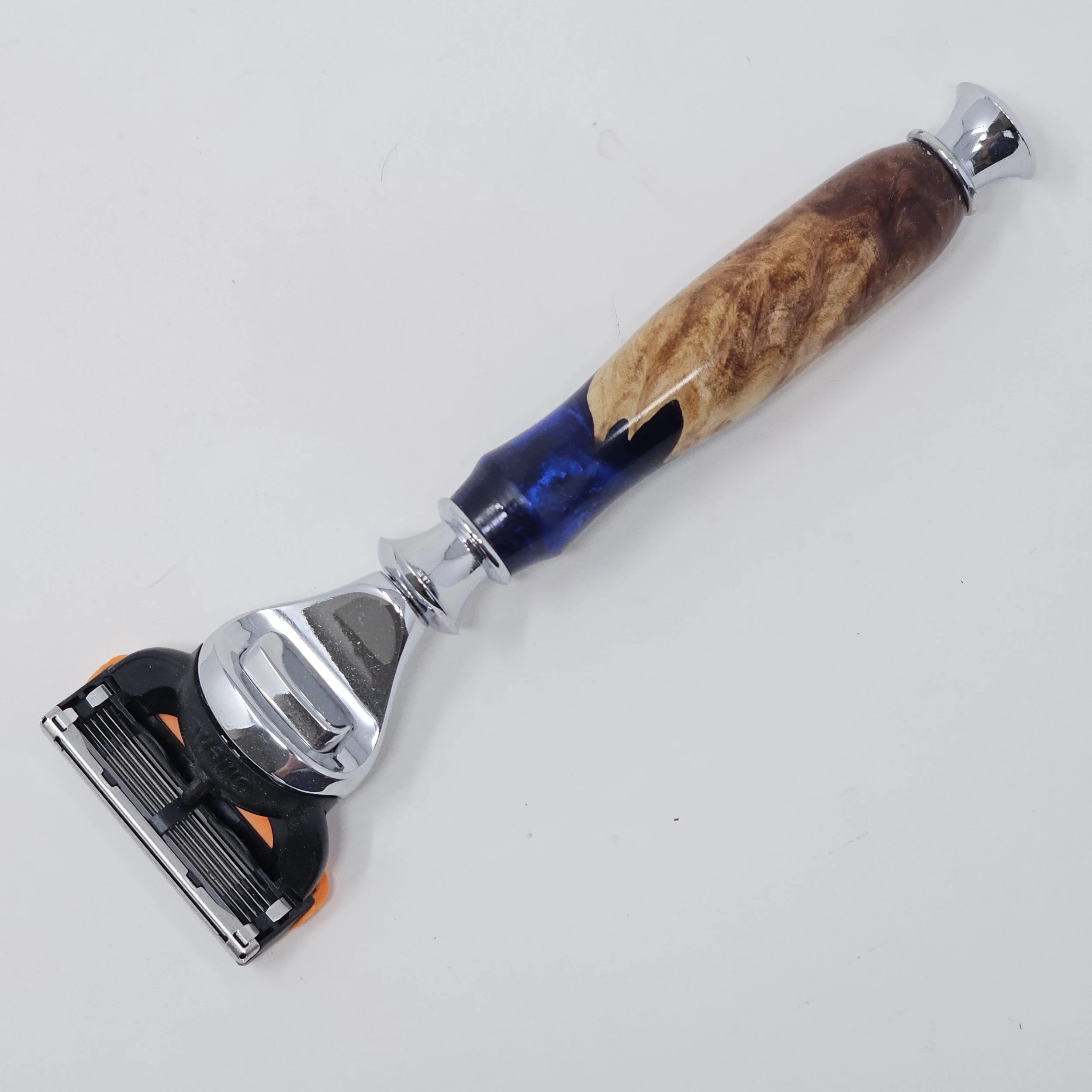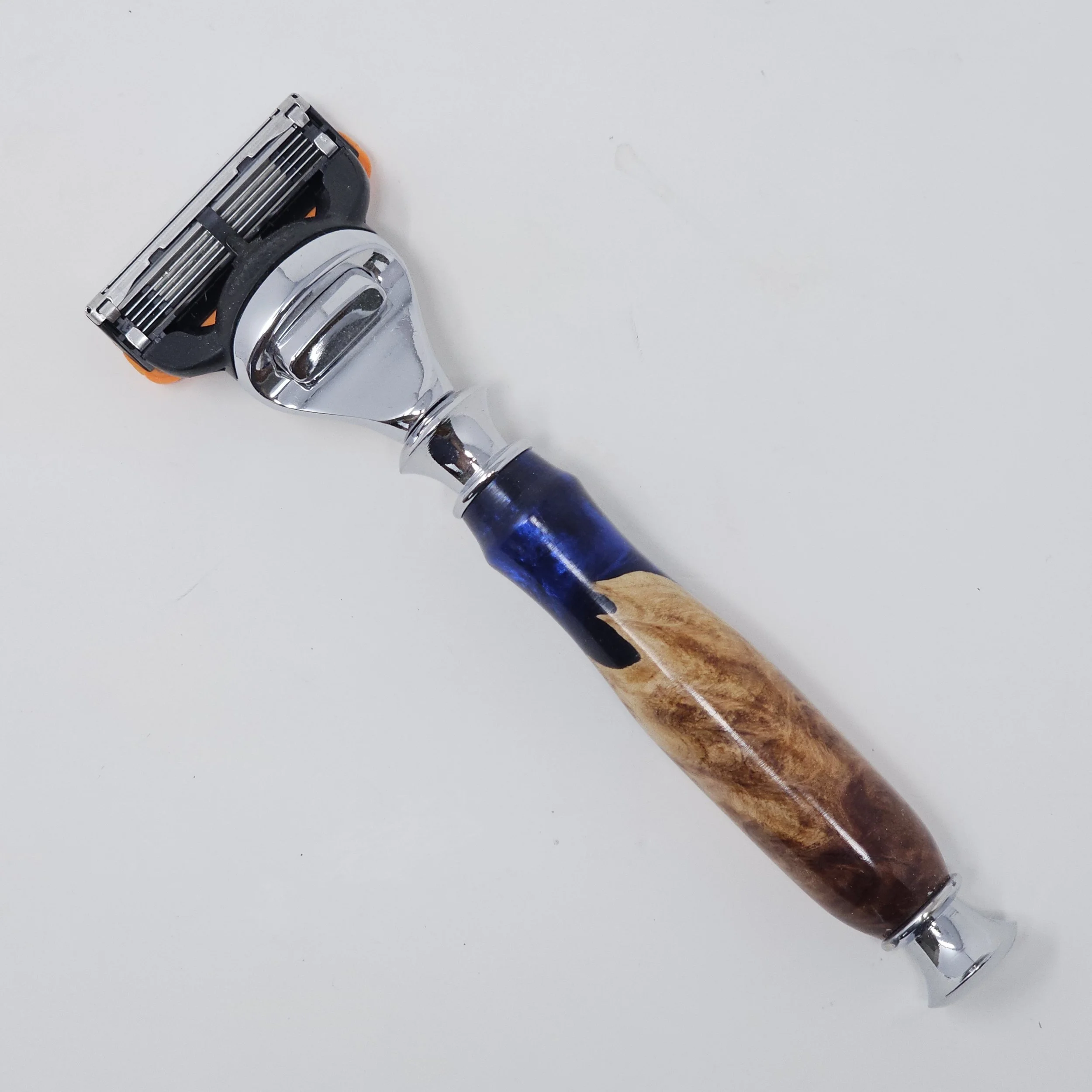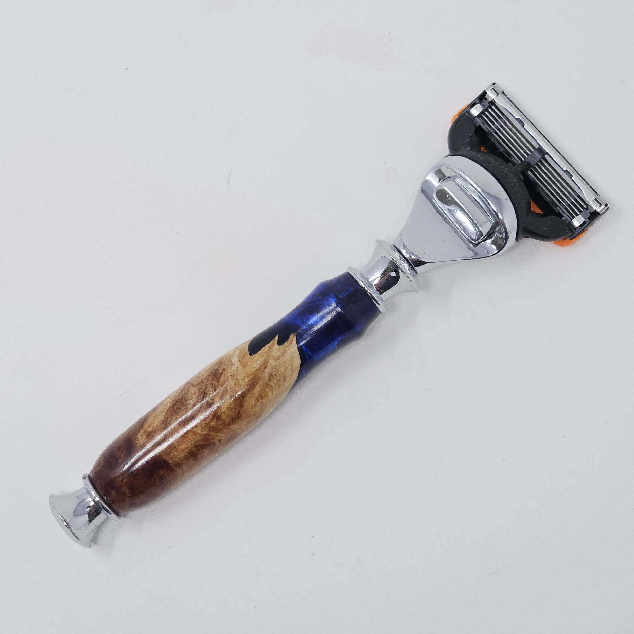 Razor for Gillette Fusion blades made from Australian Red Mallee Burl wood and blue resin. The razor is trimmed with chrome, resin was poured and turned on a lathe in my shop. It is sanded progressively down to a 12,000 grit sandpaper and finished with CA, which provides a very glossy and durable finish.