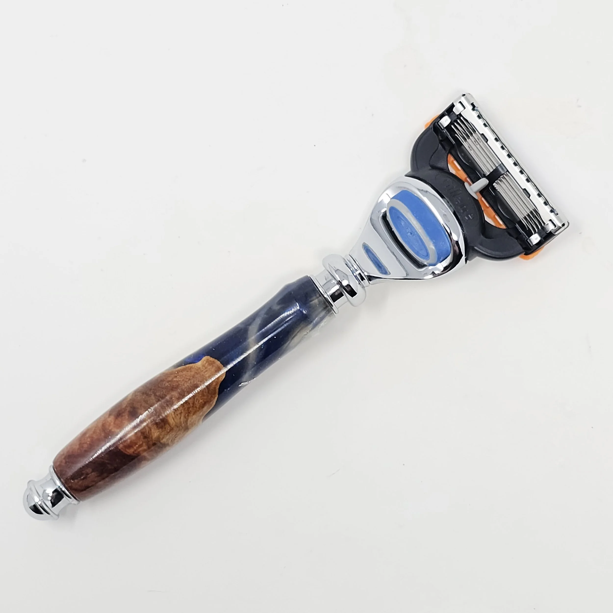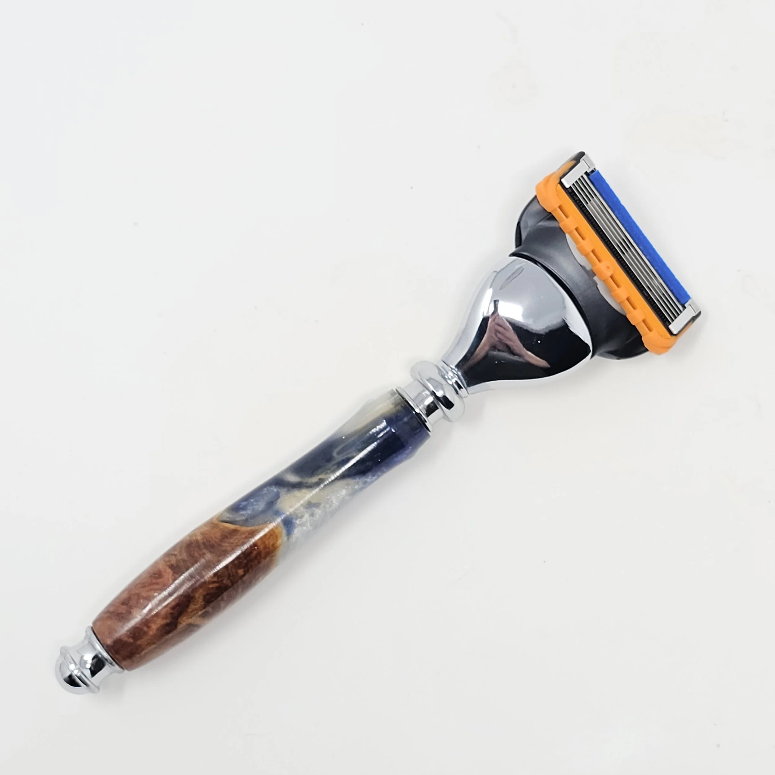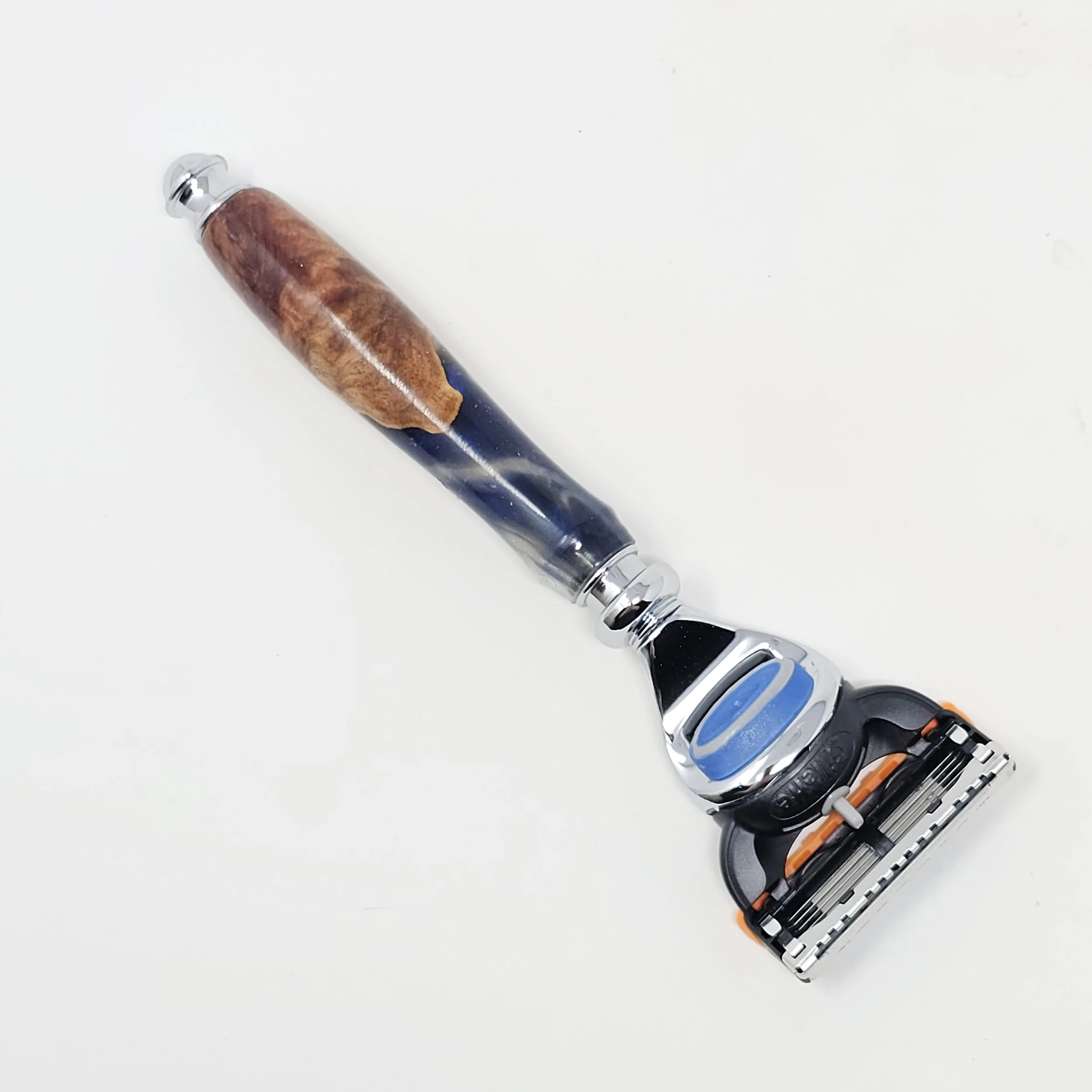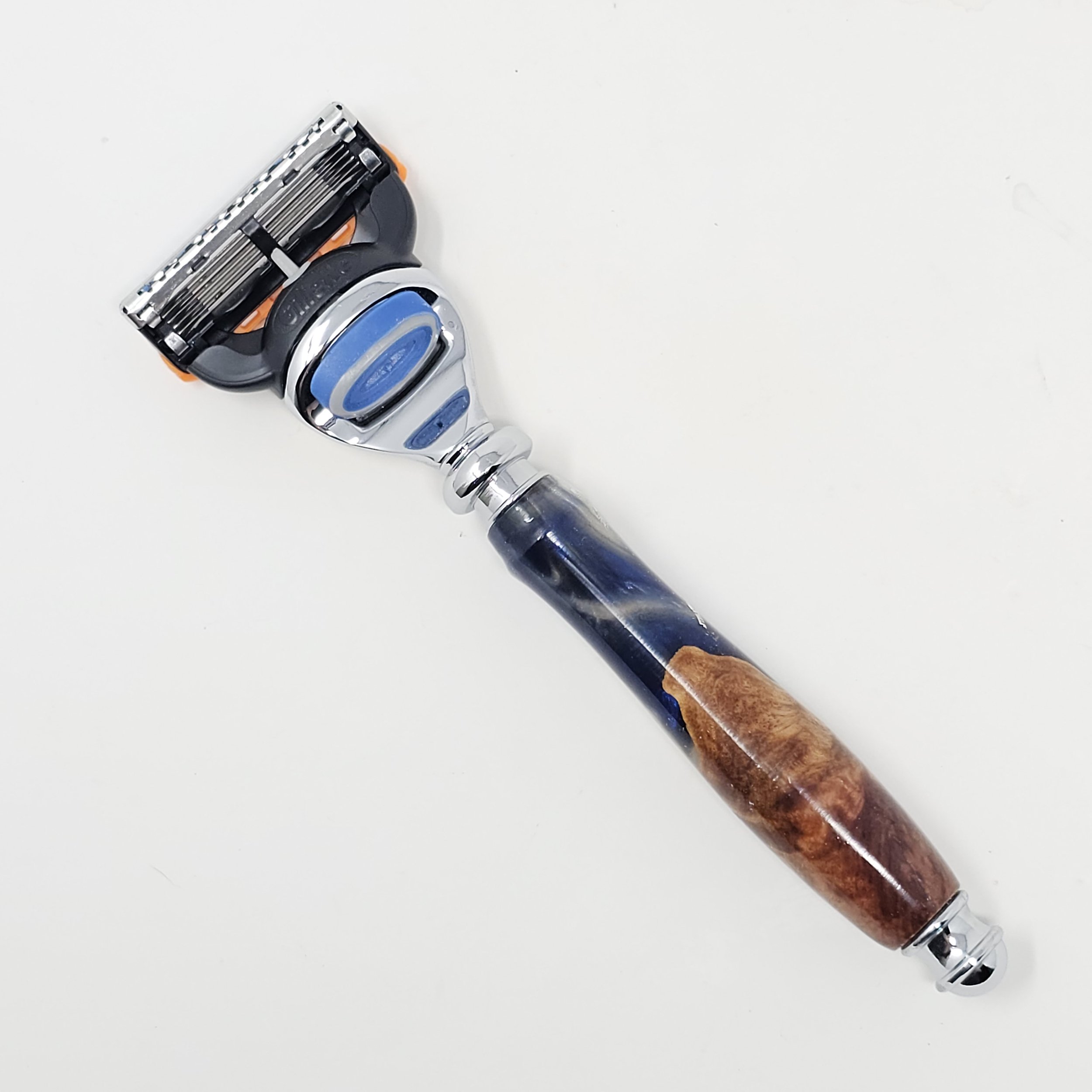 Razor for Gillette Fusion blades made from Australian Red Mallee Burl wood and blue and white swirled resin. The razor is trimmed with chrome, resin was poured and turned on a lathe in my shop. It is sanded progressively down to a 12,000 grit sandpaper and finished with CA, which provides a very glossy and durable finish.