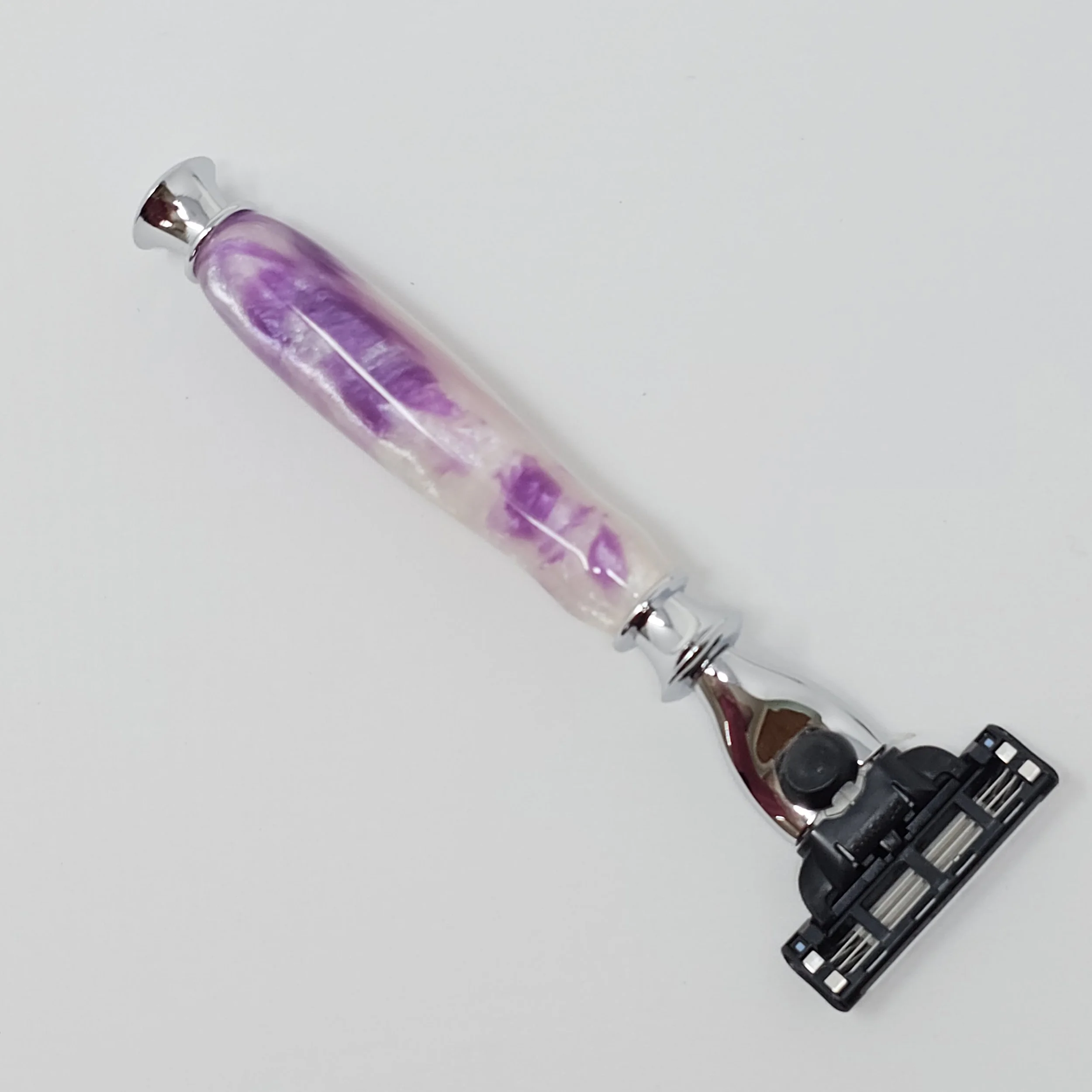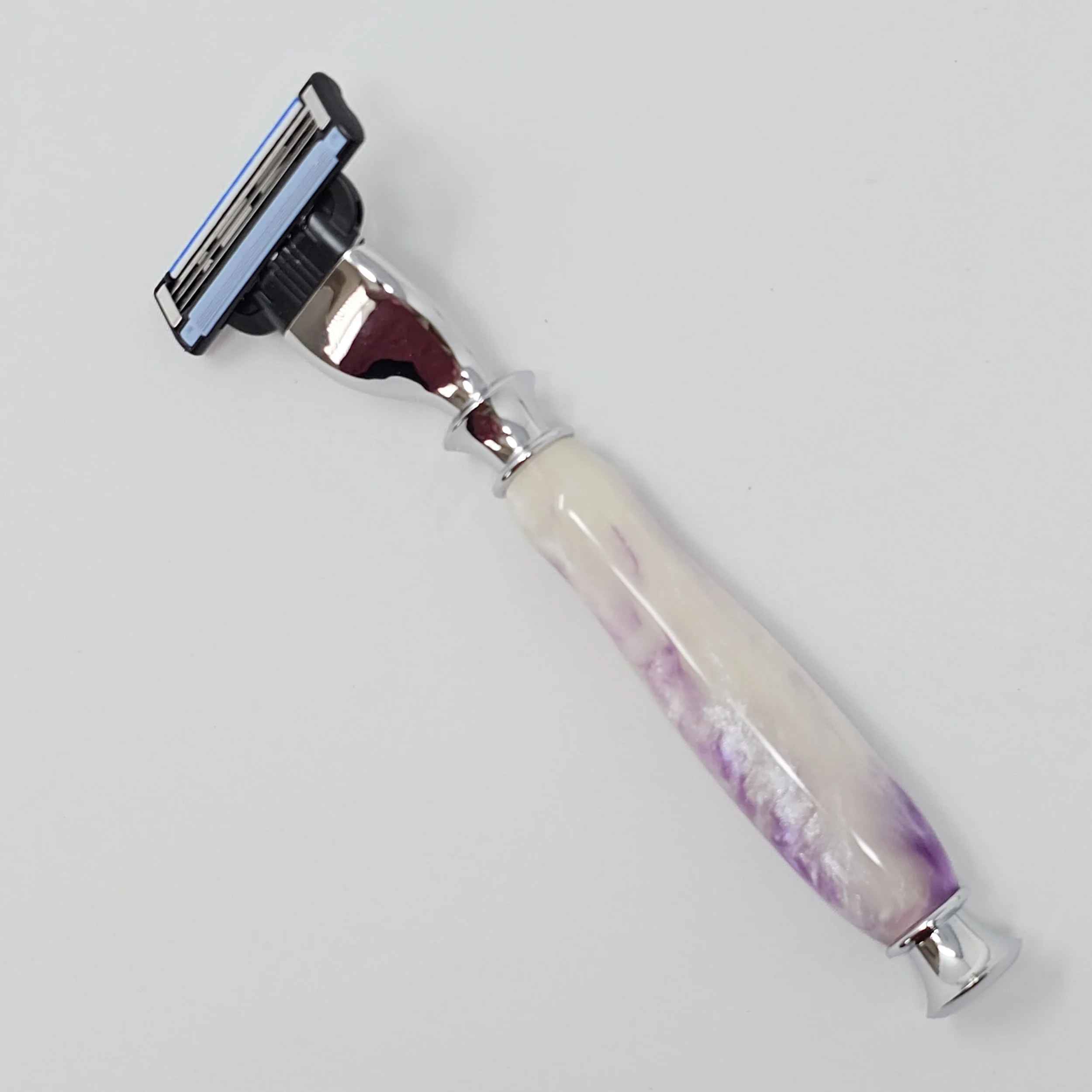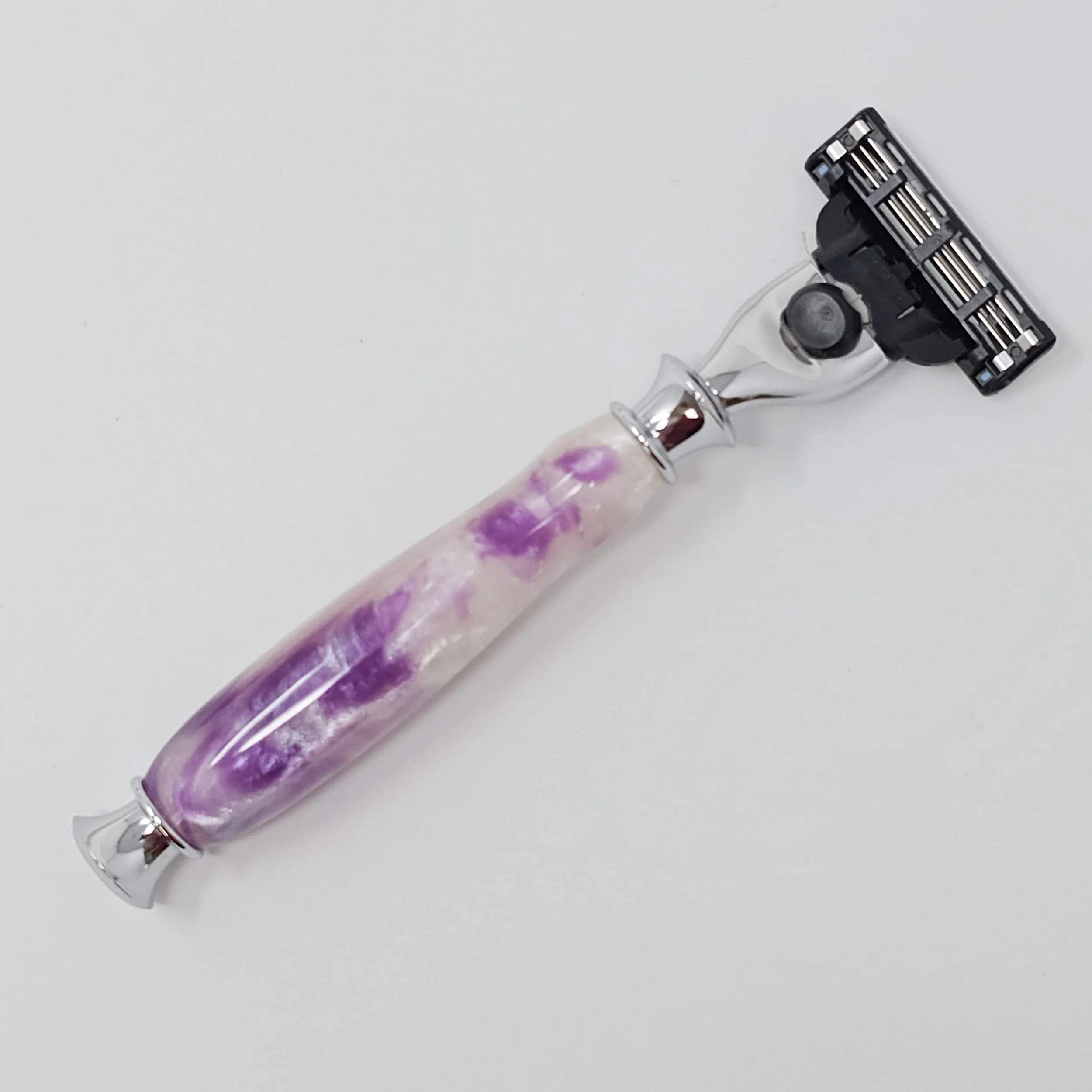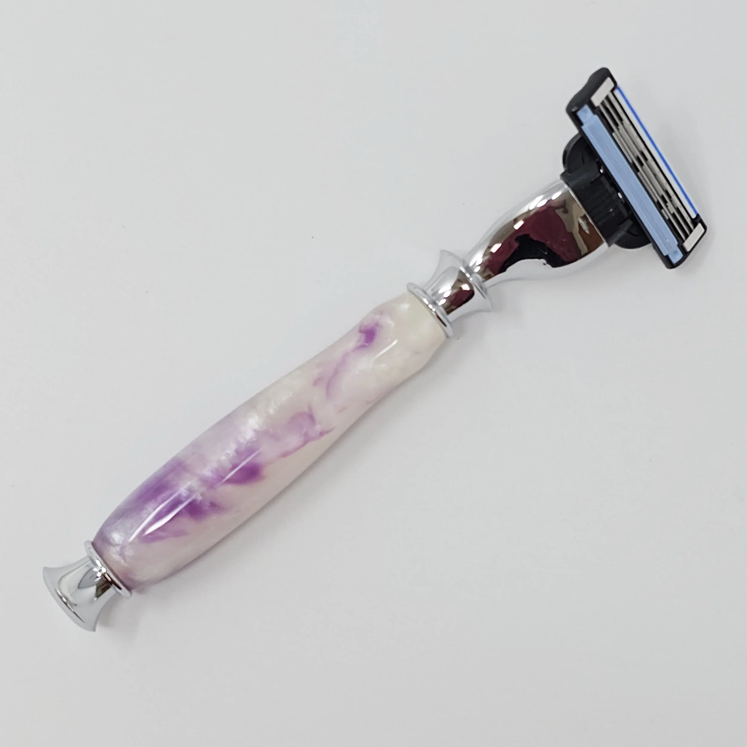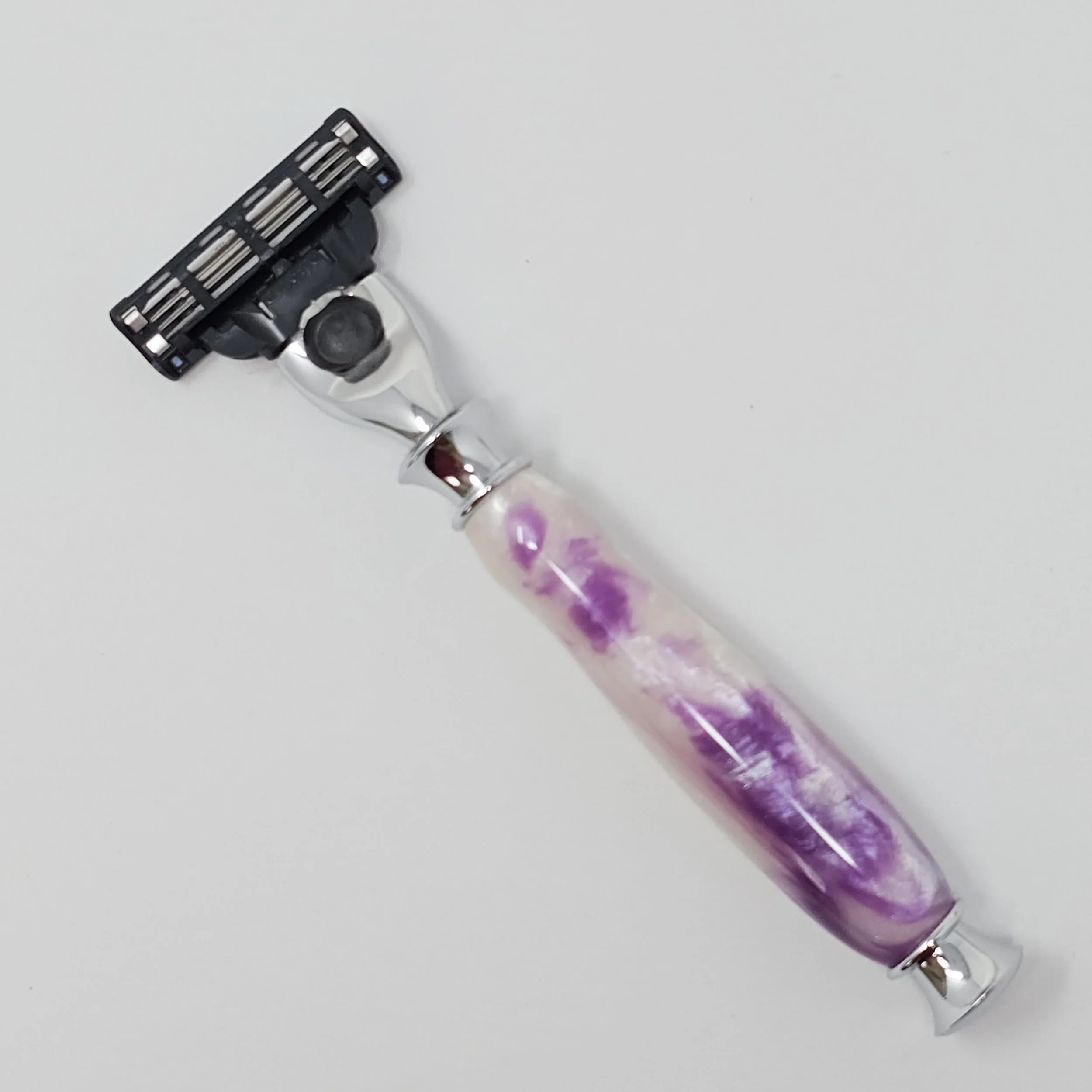 Shaving Razors › Purple and White Mach 3/Venus razor Image 1 of 6 Image 2 of 6 Image 3 of 6 Image 4 of 6 Image 5 of 6 Image 6 of 6 Purple and White Mach 3/Venus razor $35.00 Razor made purple and white swirled resin. The razor head will fit Gillette Venus or Mach 3 blades. Add To Cart Added! Razor made purple and white swirled resin. The razor head will fit Gillette Venus or Mach 3 blades.