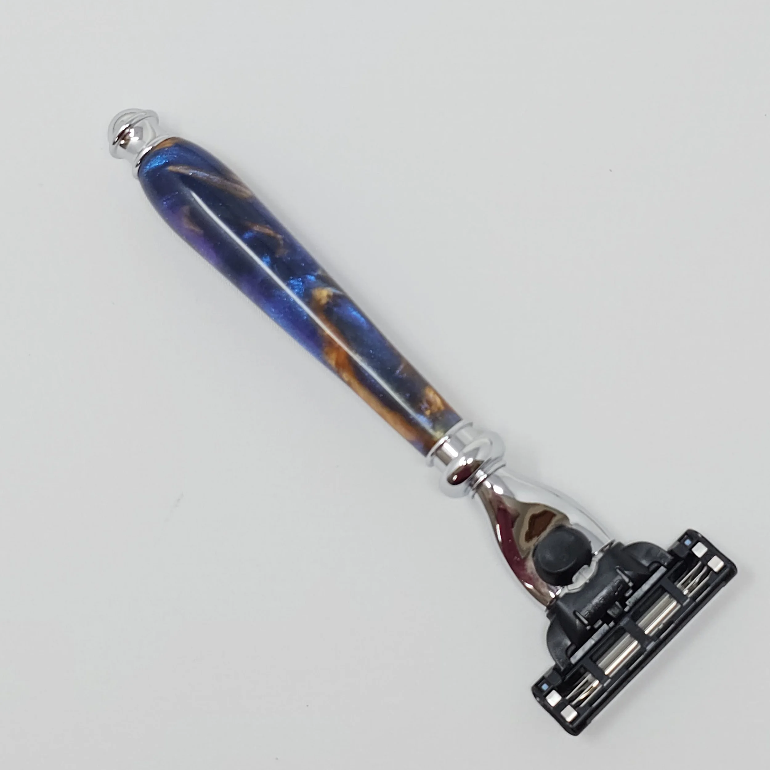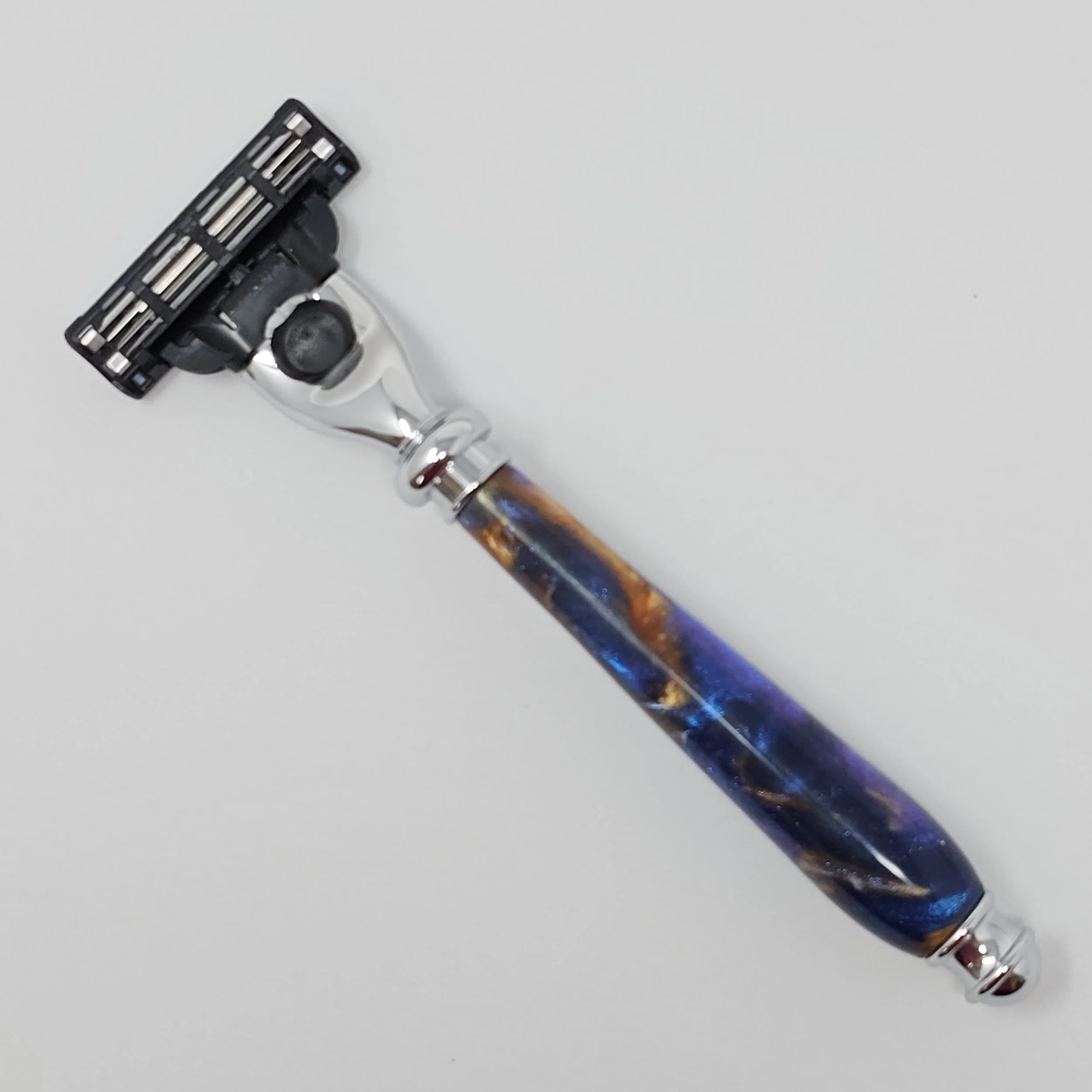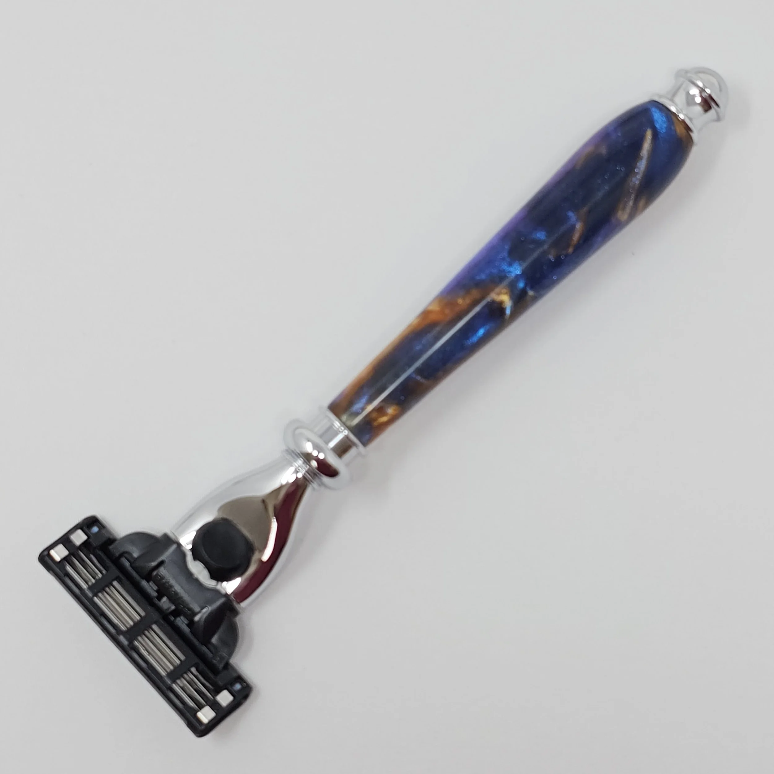 Razor made from multi-colored swirled resin (blue, purple and gold). The razor head will fit Gillette Venus or Mach 3 blades.