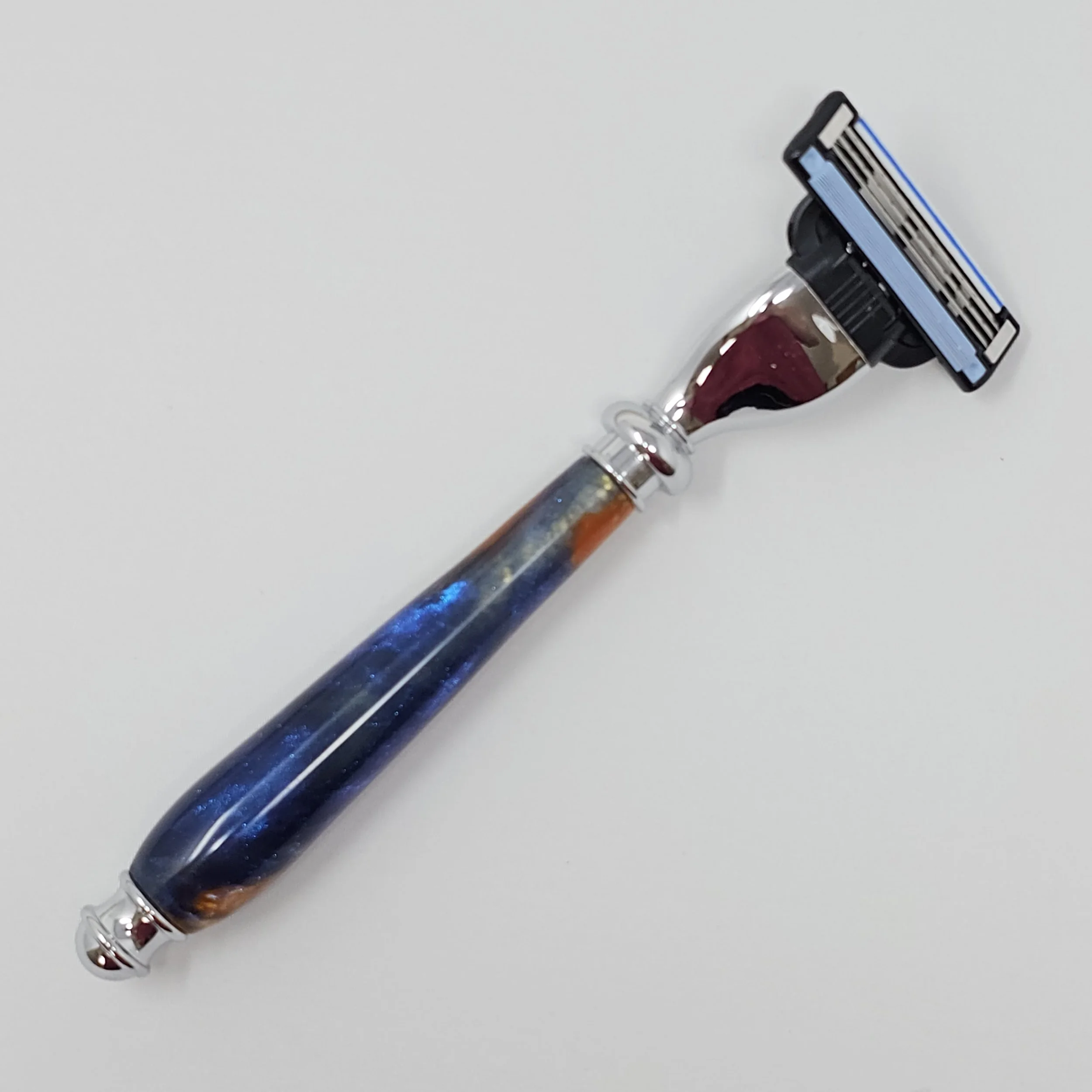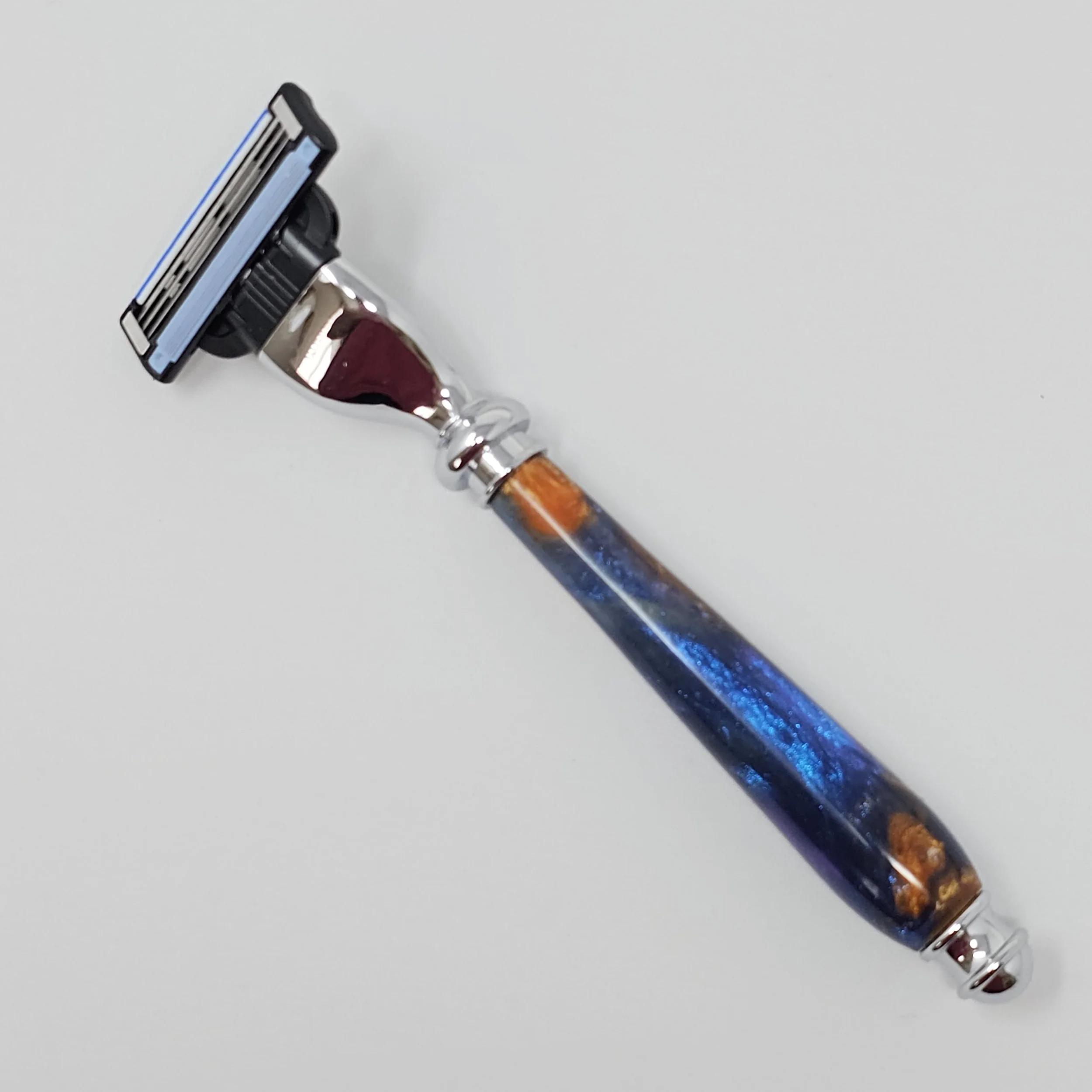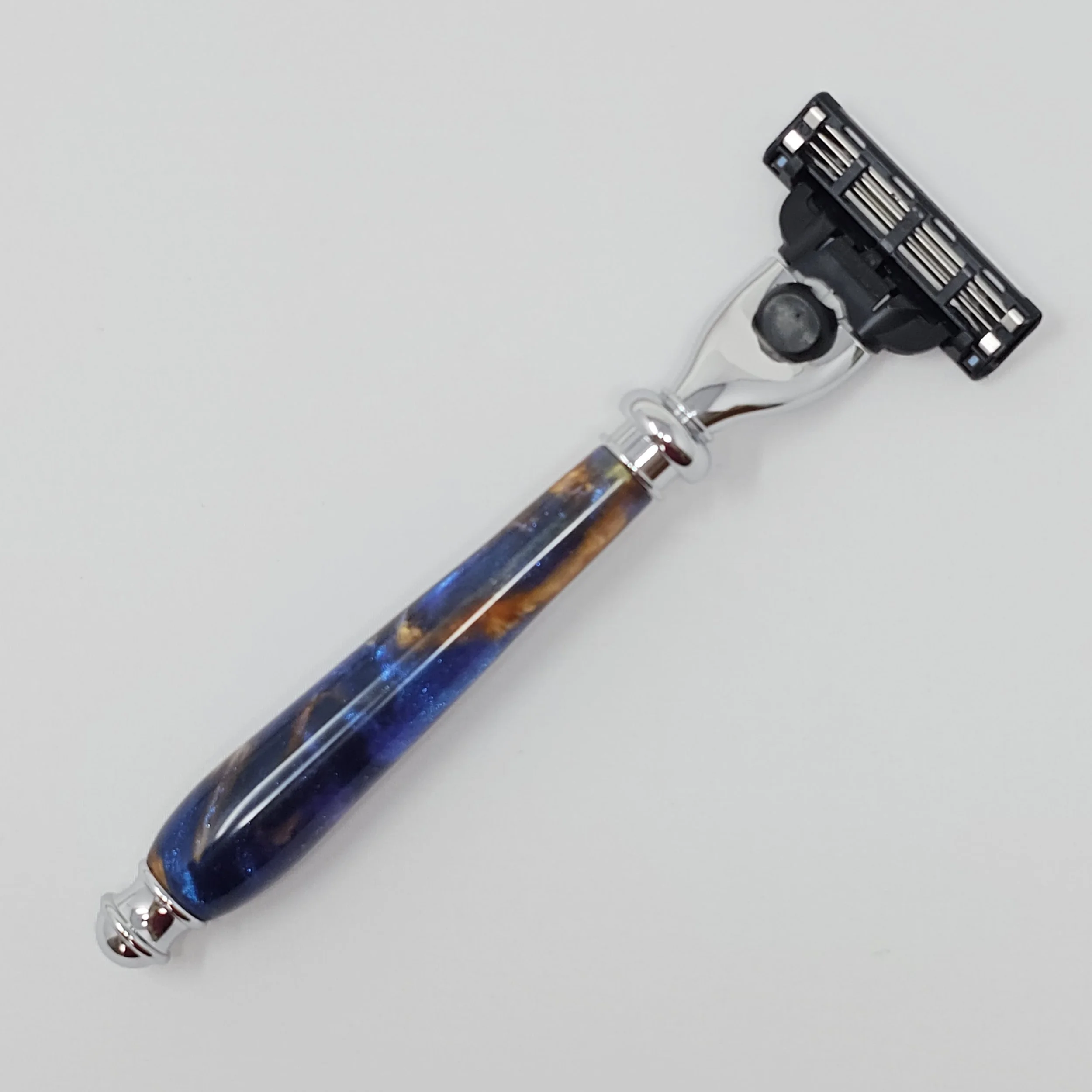 Razor made from multi-colored swirled resin (blue, purple and gold). The razor head will fit Gillette Venus or Mach 3 blades.