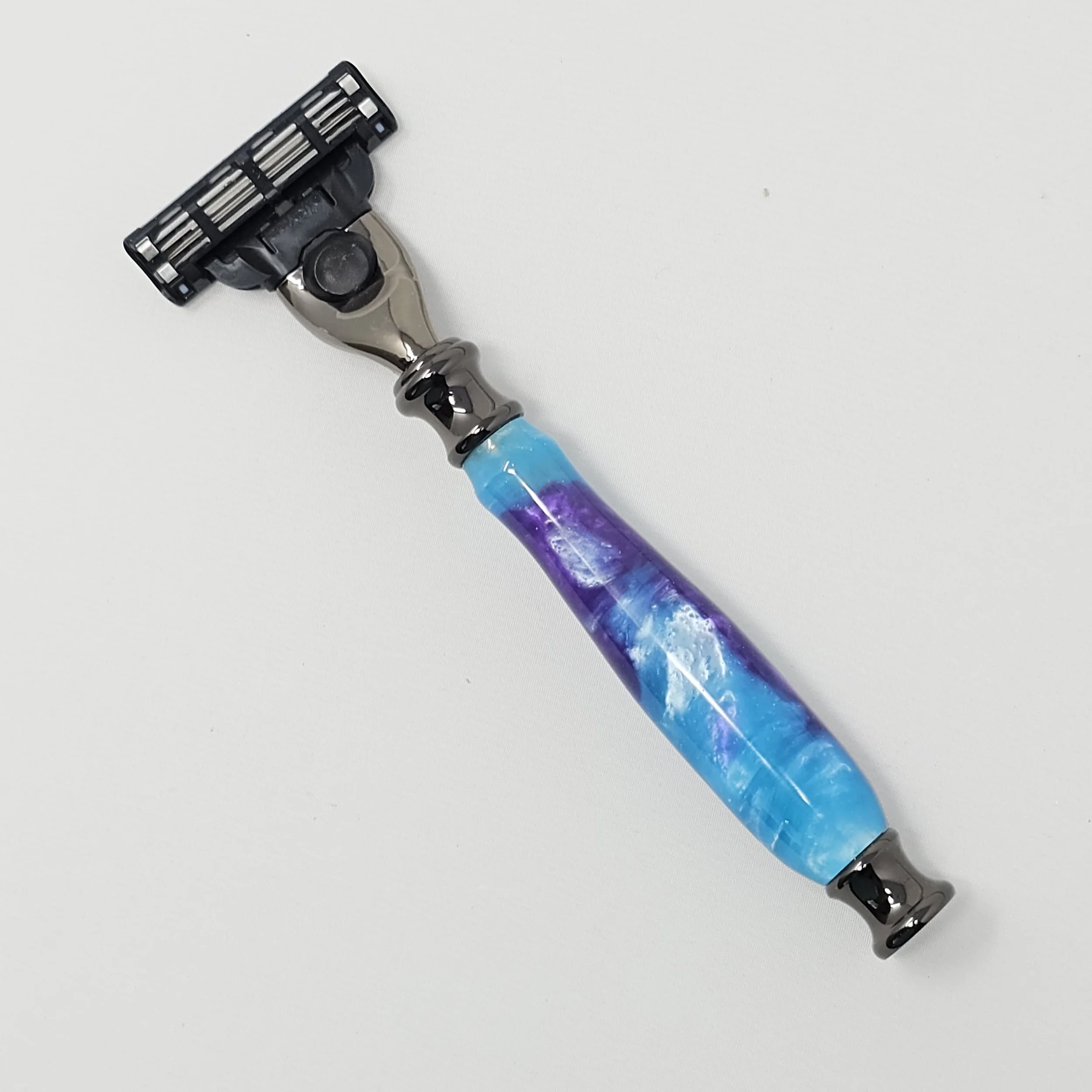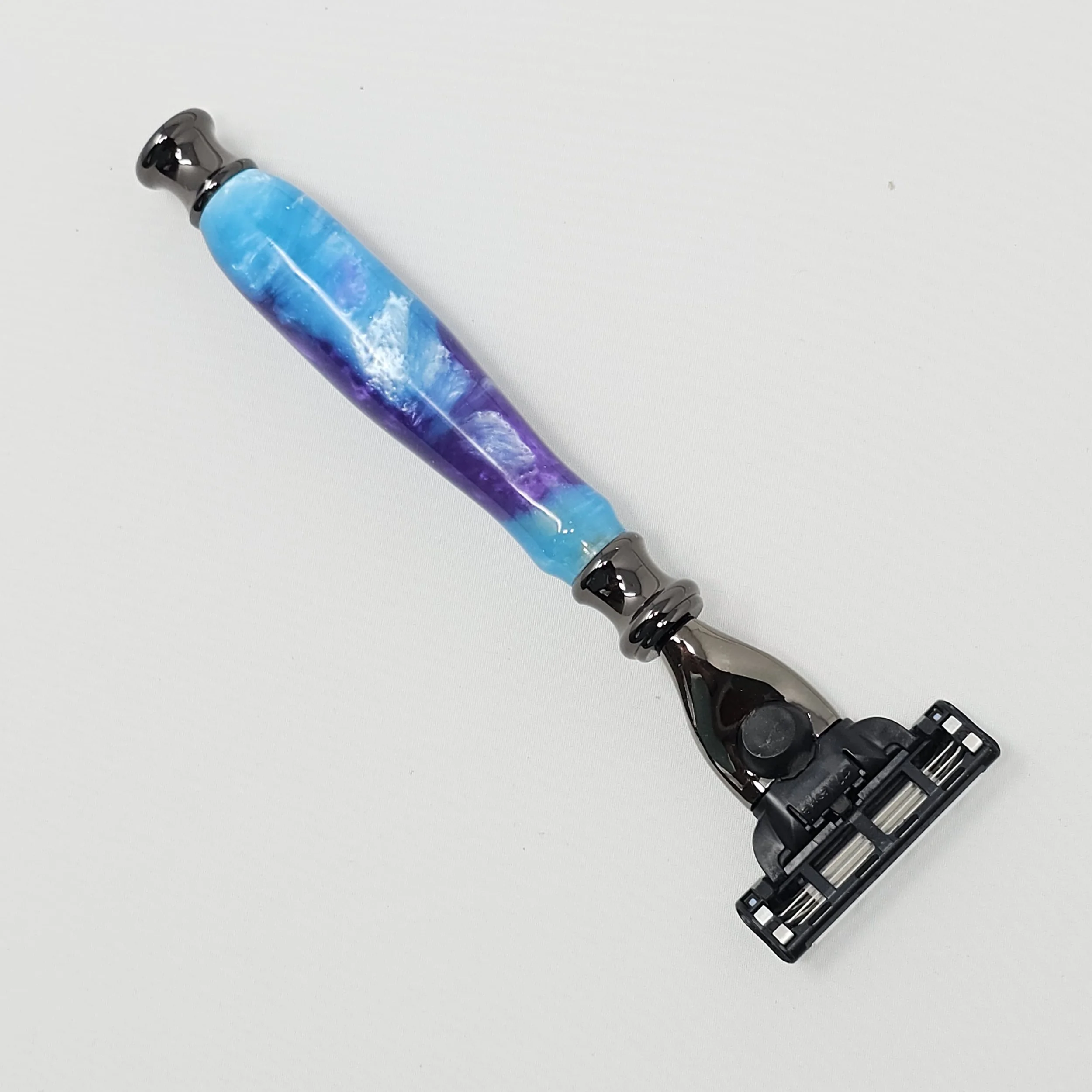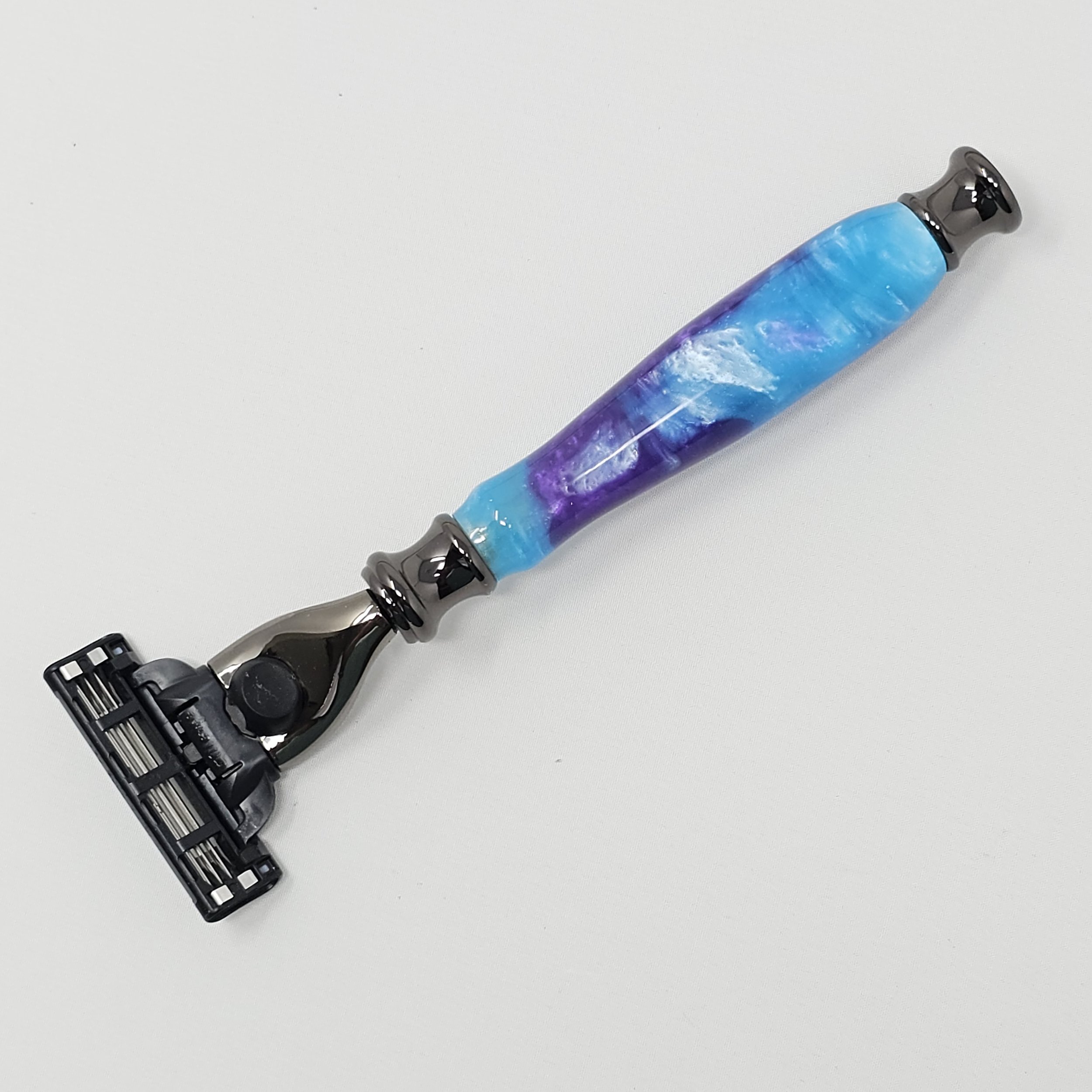Razor for Gillette Mach 3 or Venus blades made from blue & purple swirled acrylic. The razor is trimmed with gun metal parts and was hand-turned in my shop. It is sanded progressively down to a 12,000 grit sandpaper and then finished with a friction polish finish.