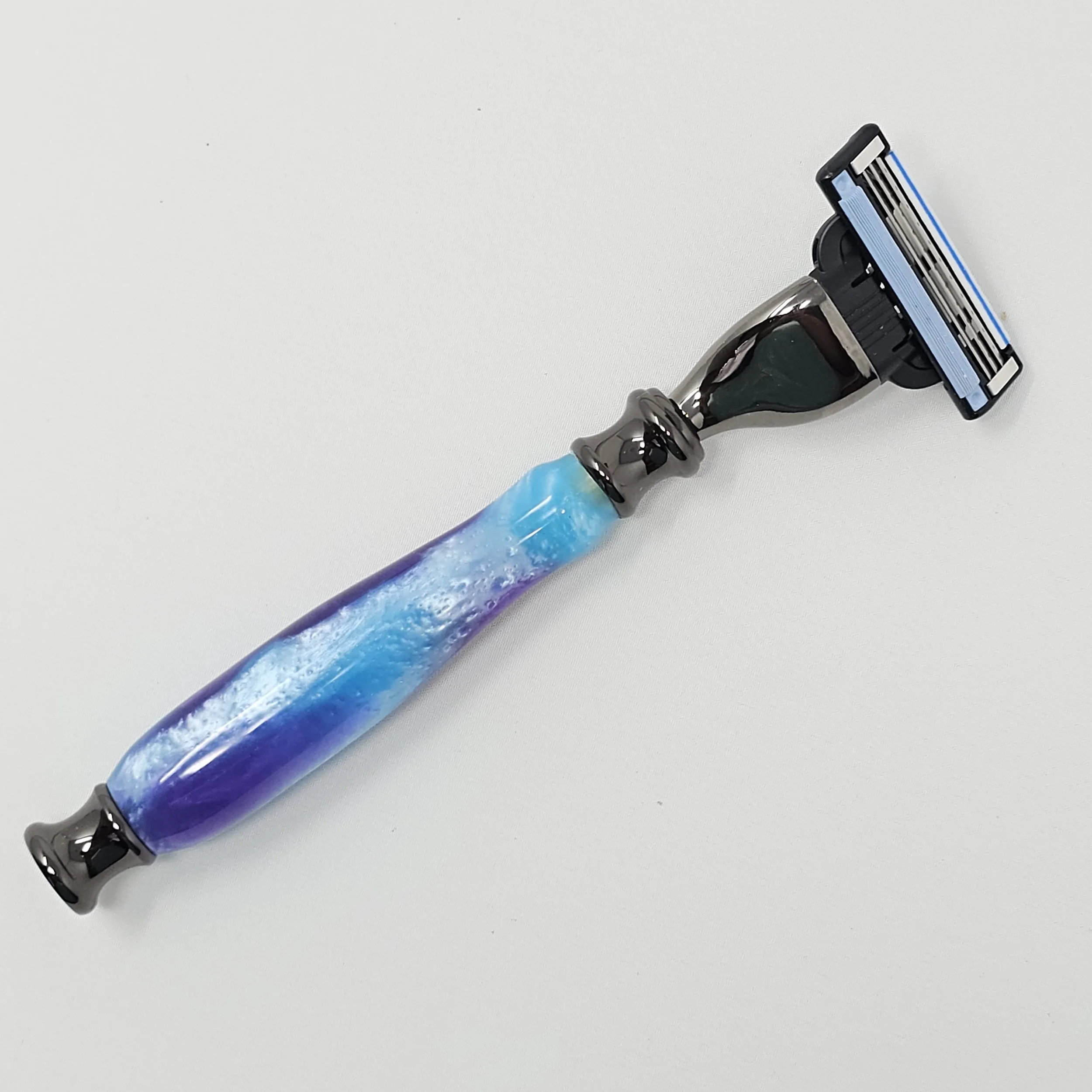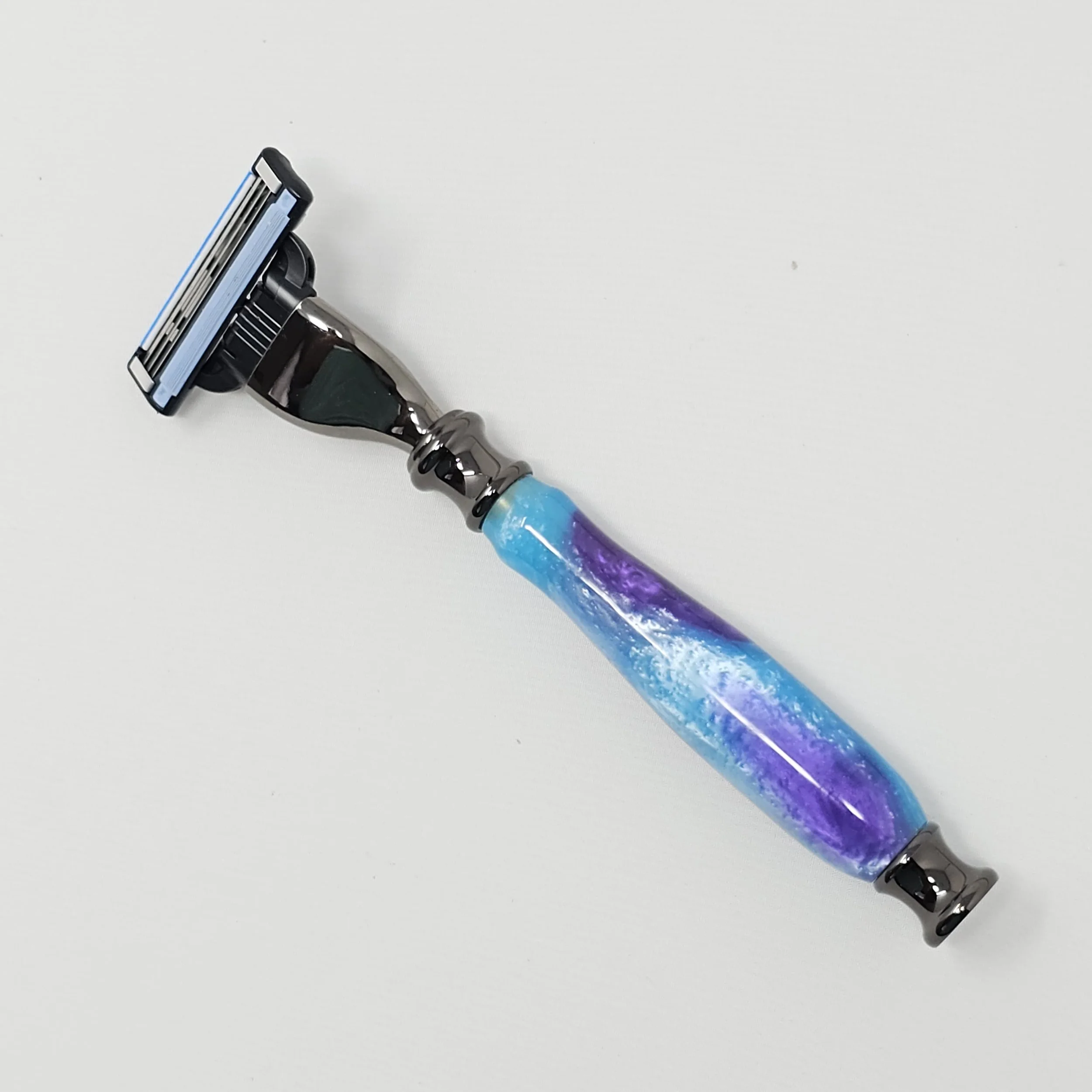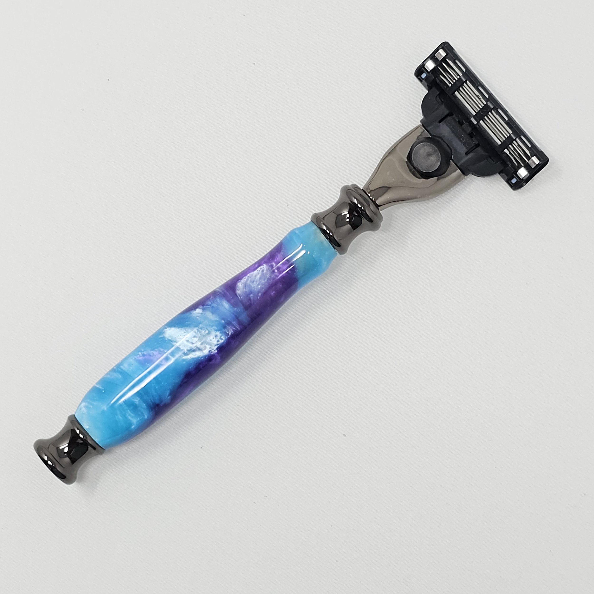 Razor for Gillette Mach 3 or Venus blades made from blue & purple swirled acrylic. The razor is trimmed with gun metal parts and was hand-turned in my shop. It is sanded progressively down to a 12,000 grit sandpaper and then finished with a friction polish finish.