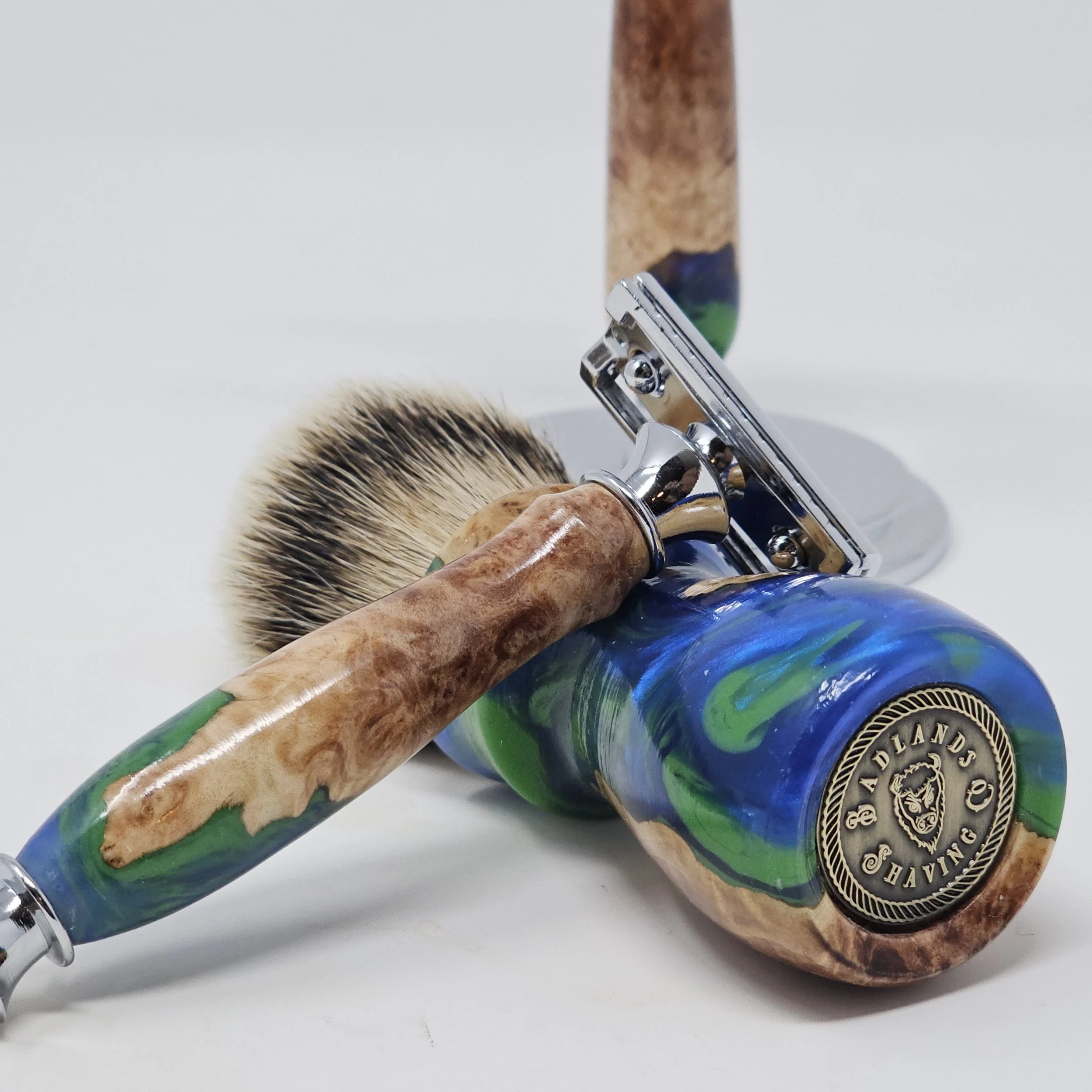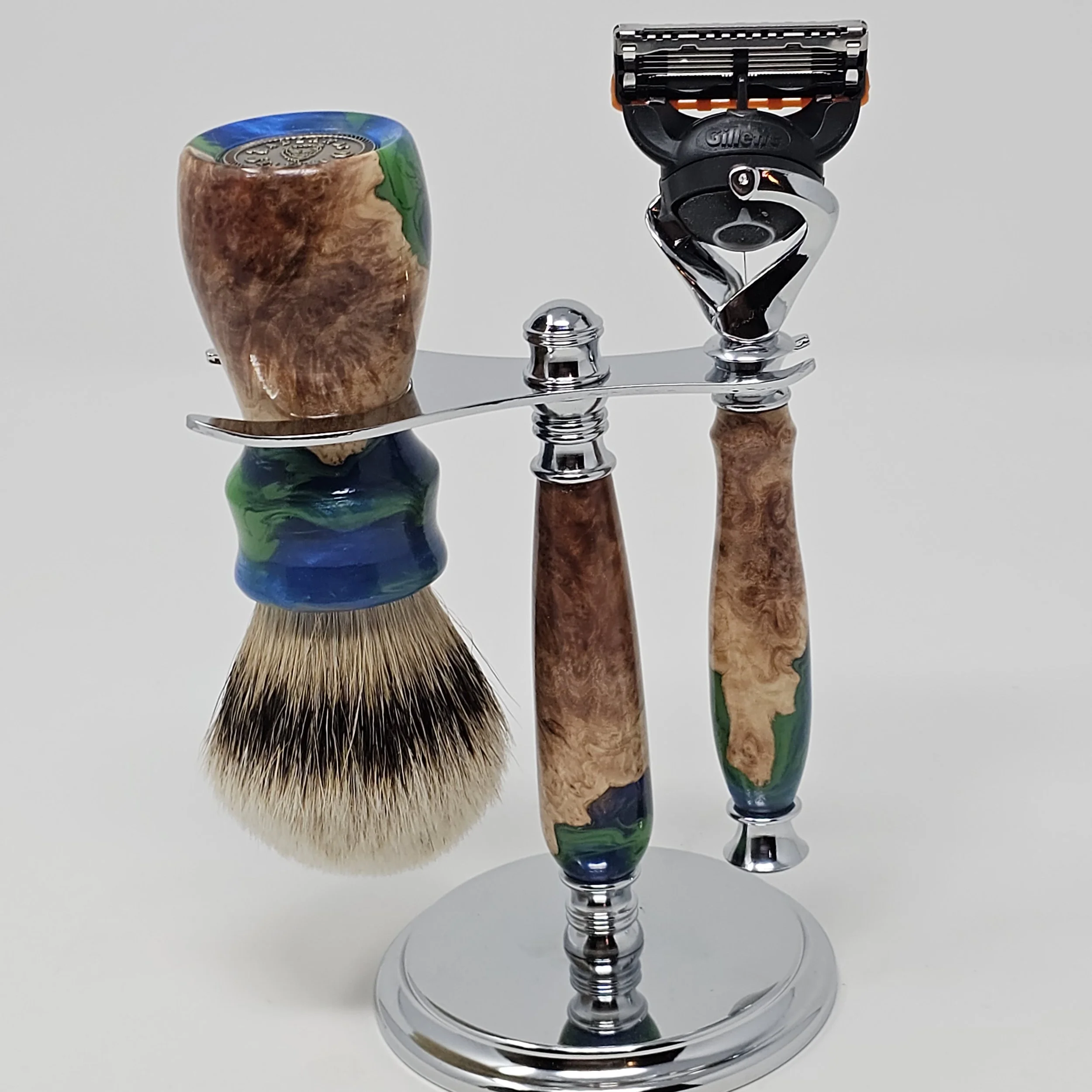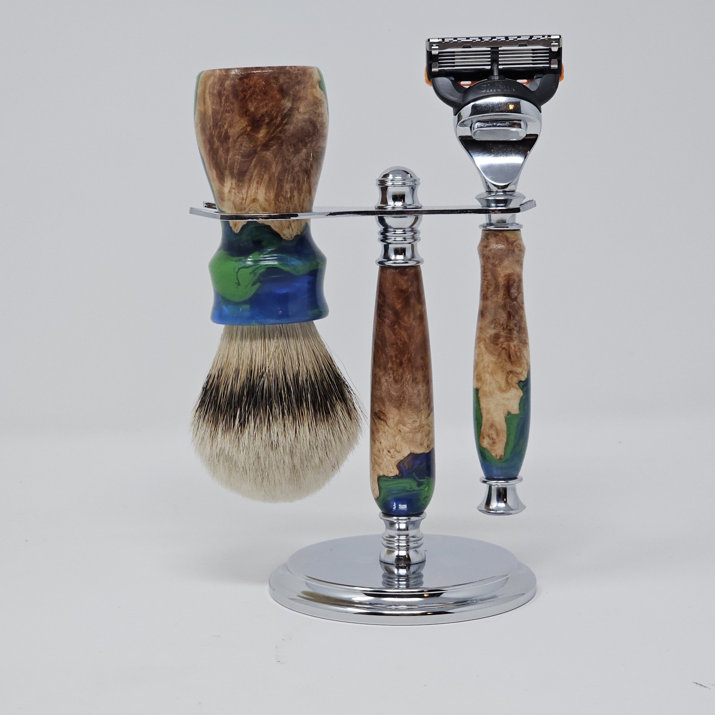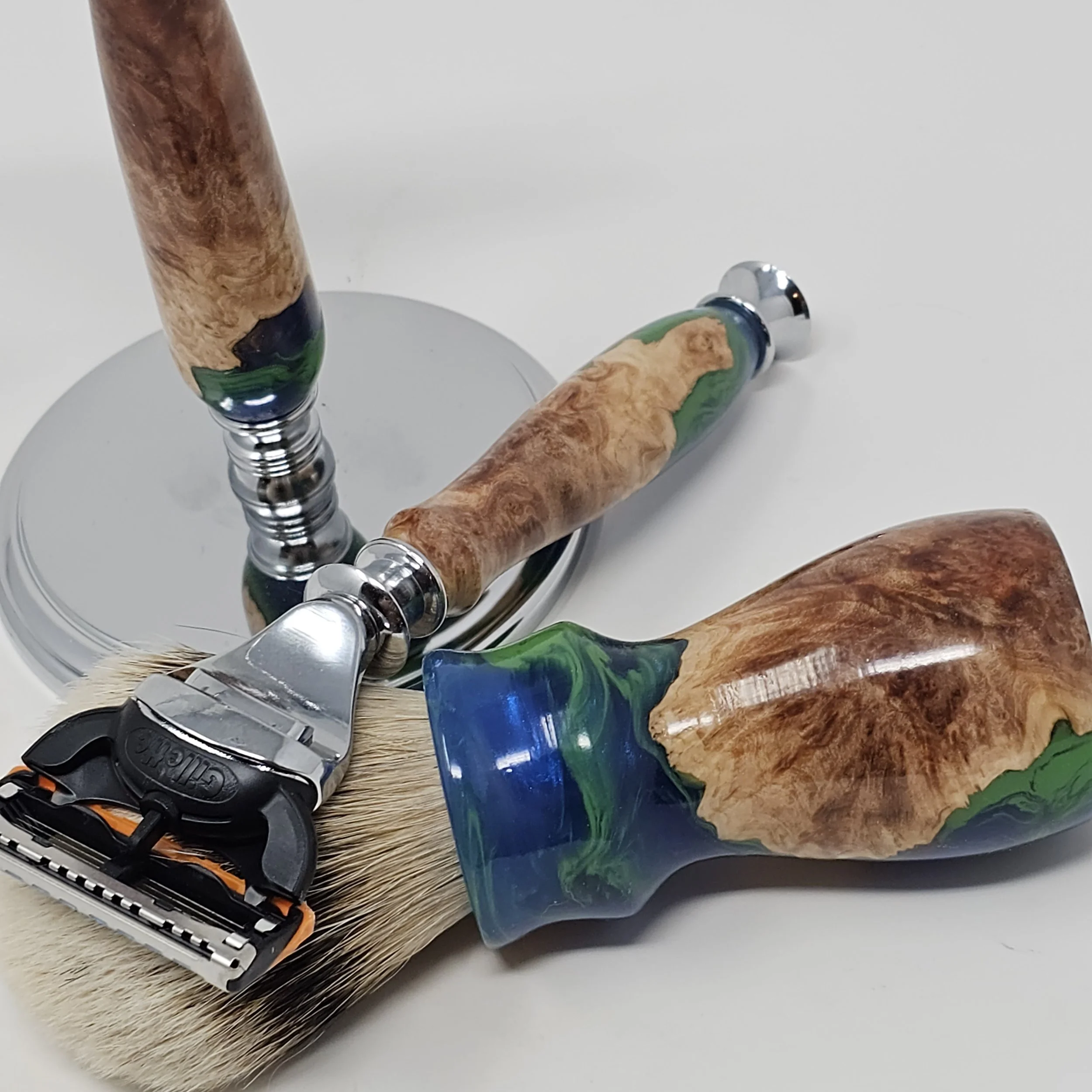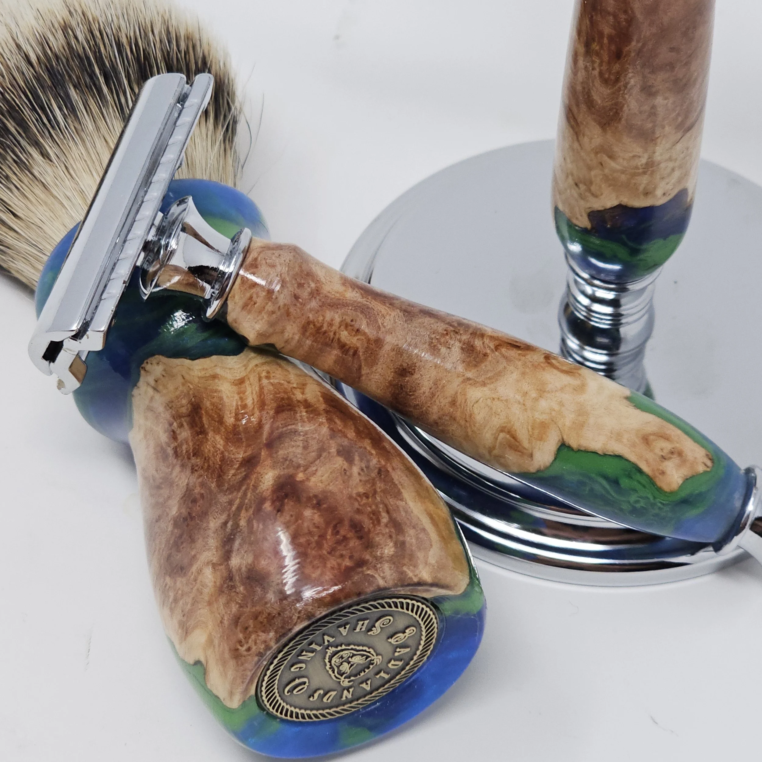 Beautiful one of a kind piece made from Australian Mallee Burl wood and blue & green swirled resin. May be purchased with or without shaving knot (26mm). Razor handle can be purchased with DE Safety, Fusion or Fusion Flexball head.